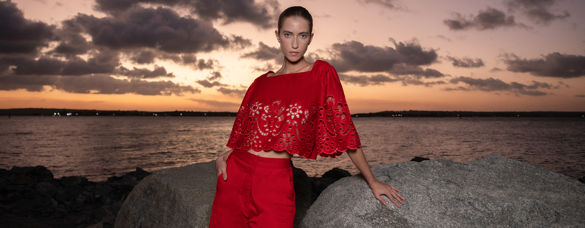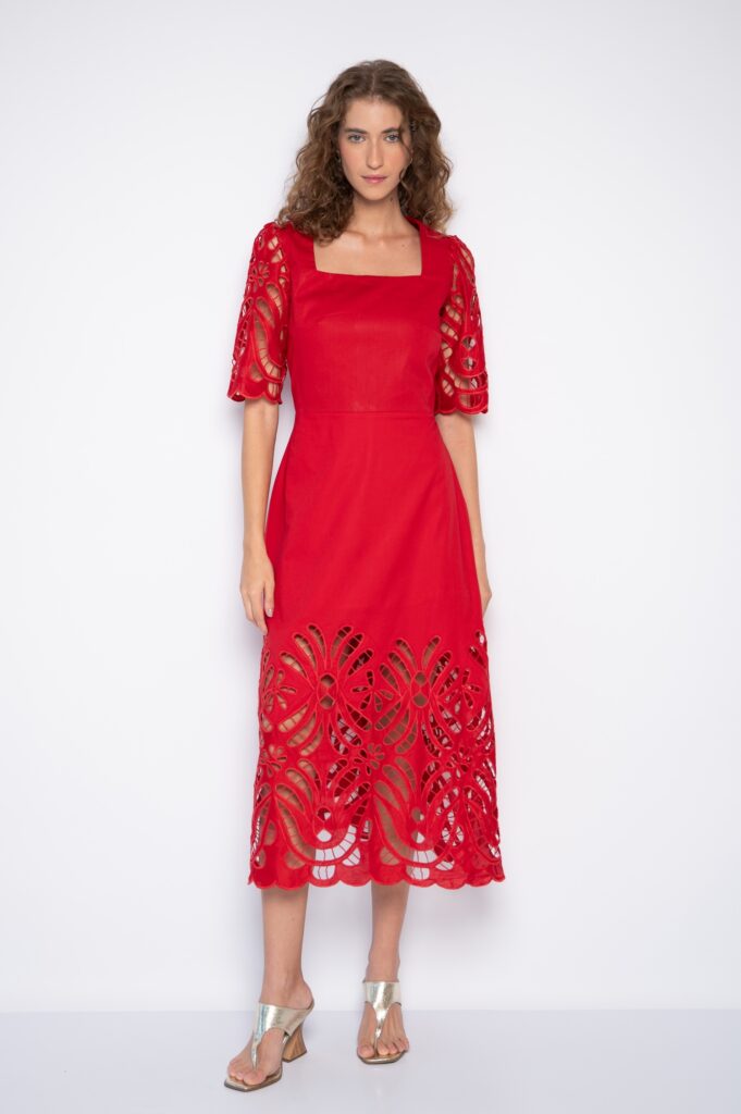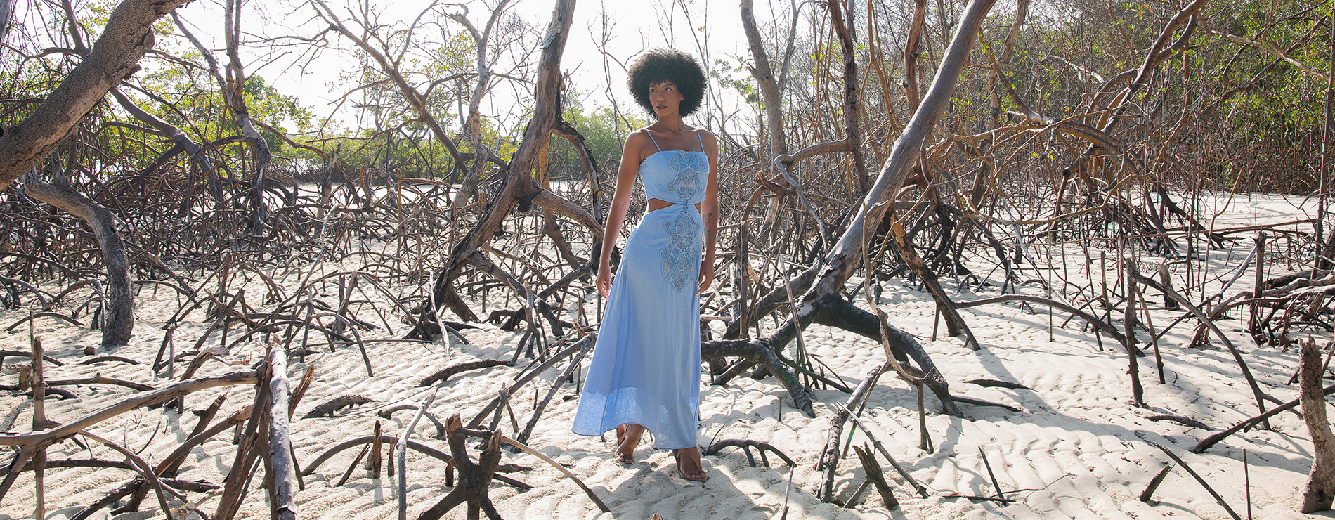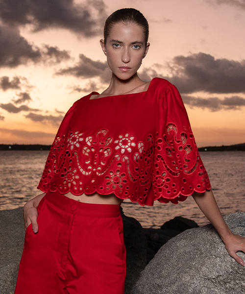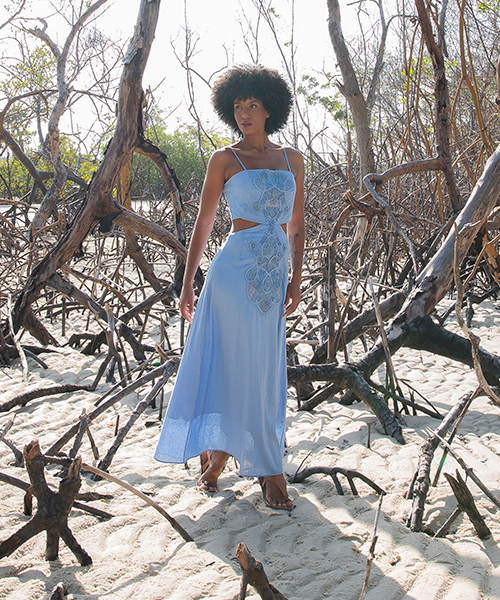 Redes de Richelieus são lançadas sobre linhos e algodões beges, brancos e perolados, abraçando, em detalhes ou completamente, mangas, bustos, barras, pernas e costas. Agulhas anzoleiras bordando e prespontando peças encantadoras como sereias pernambucanas. Um cardume elegante e atemporal composto por blusas, bata e bermudas; camisaria, calça e corselet; short, saias e vestido marmeid. Roupas híbridas em beleza sofisticada e liberdade confortável para navegar pelos dias e noites de verão.