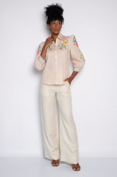 Camisa com babado e bordado richelieu coral – LÍGIA