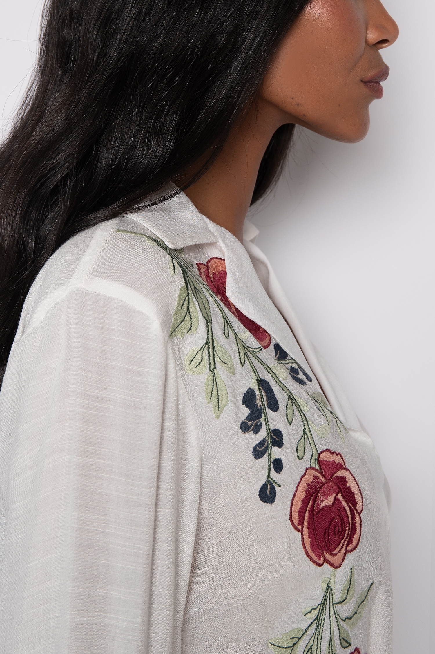 A bata bordada feminina com manga 7/8 expressa elegância leve, enquanto constrói um visual sofisticado desde a introdução.