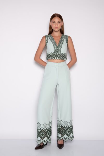 O bordado cria um ponto focal sofisticado no visual. Assim, a peça se destaca mesmo em produções minimalistas.