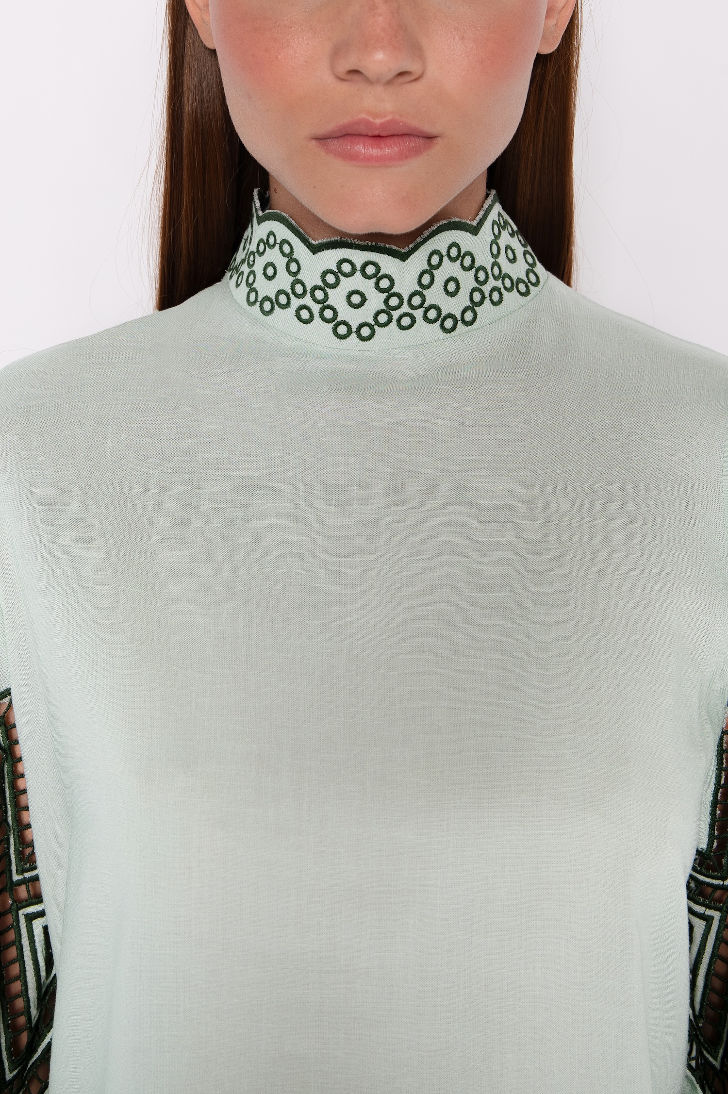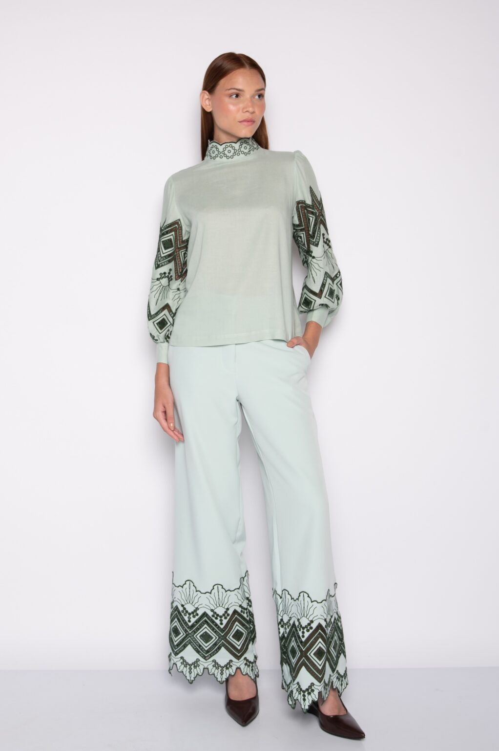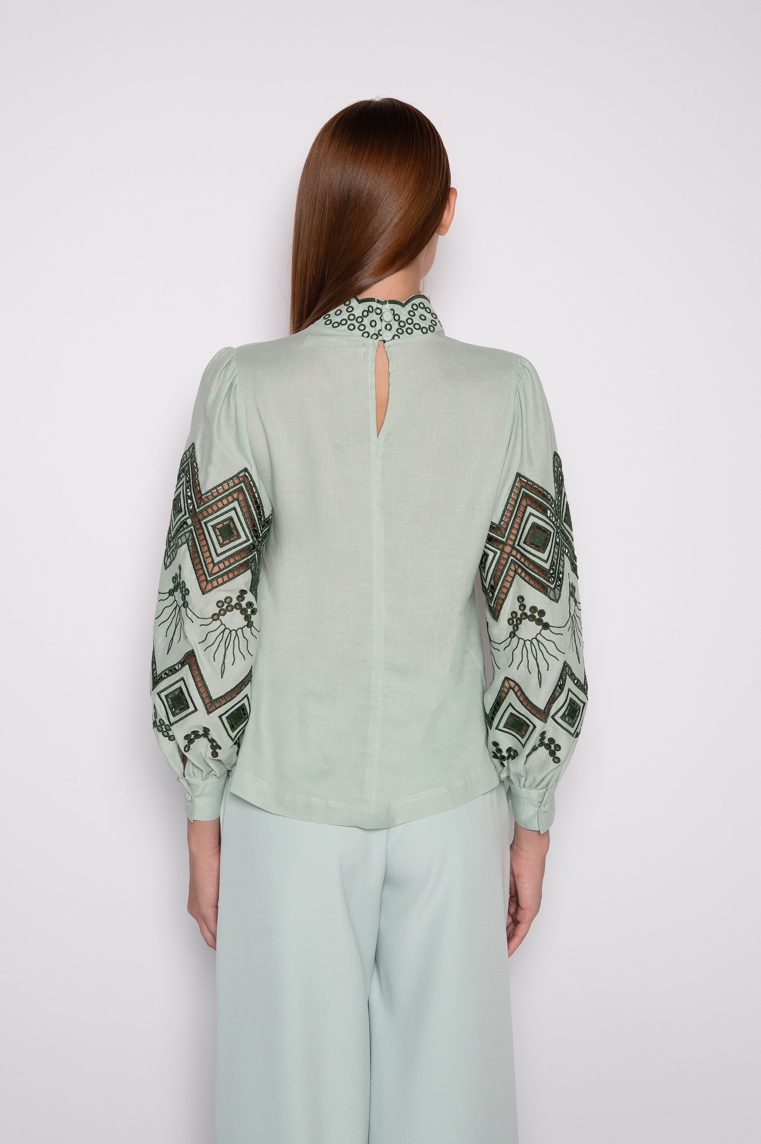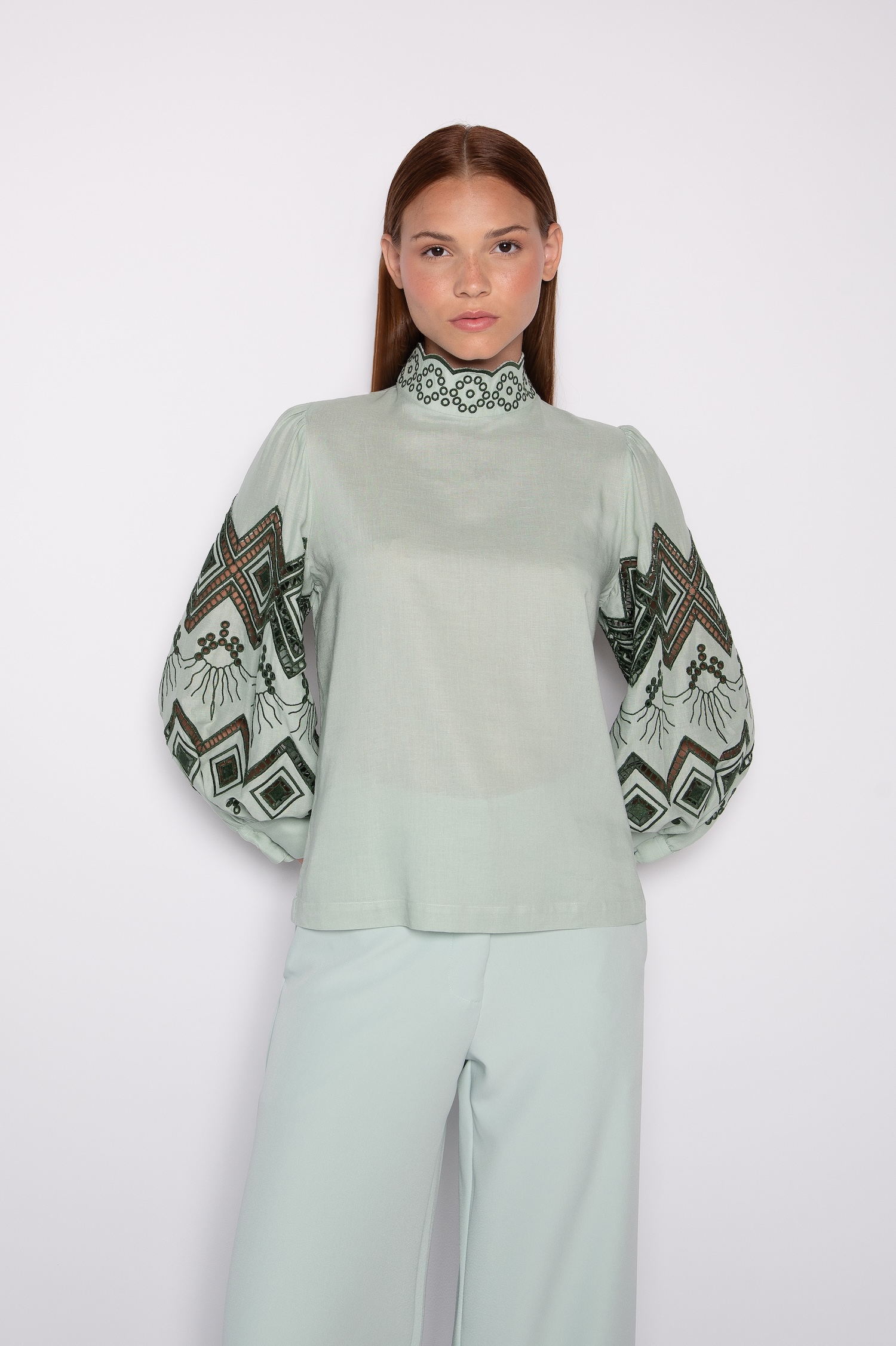 Blusa Bordada Com Gola Alta e Mangas Bufantes 7/8 Verde Claro – Juliana