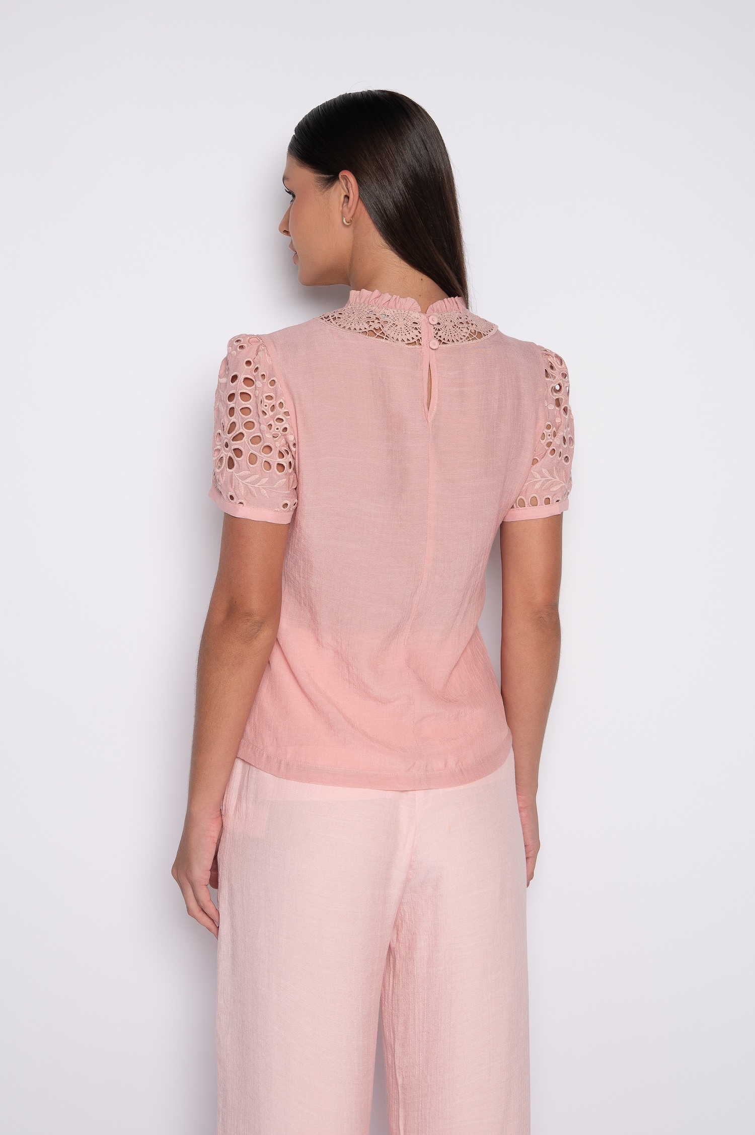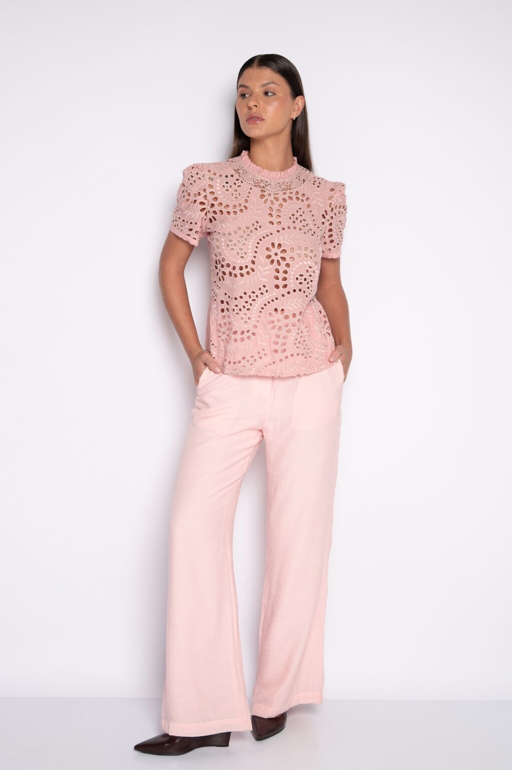 A blusa bordada manga curta combina delicadeza e sofisticação em um design versátil. Além disso, o bordado valoriza o visual com textura e charme feminino.