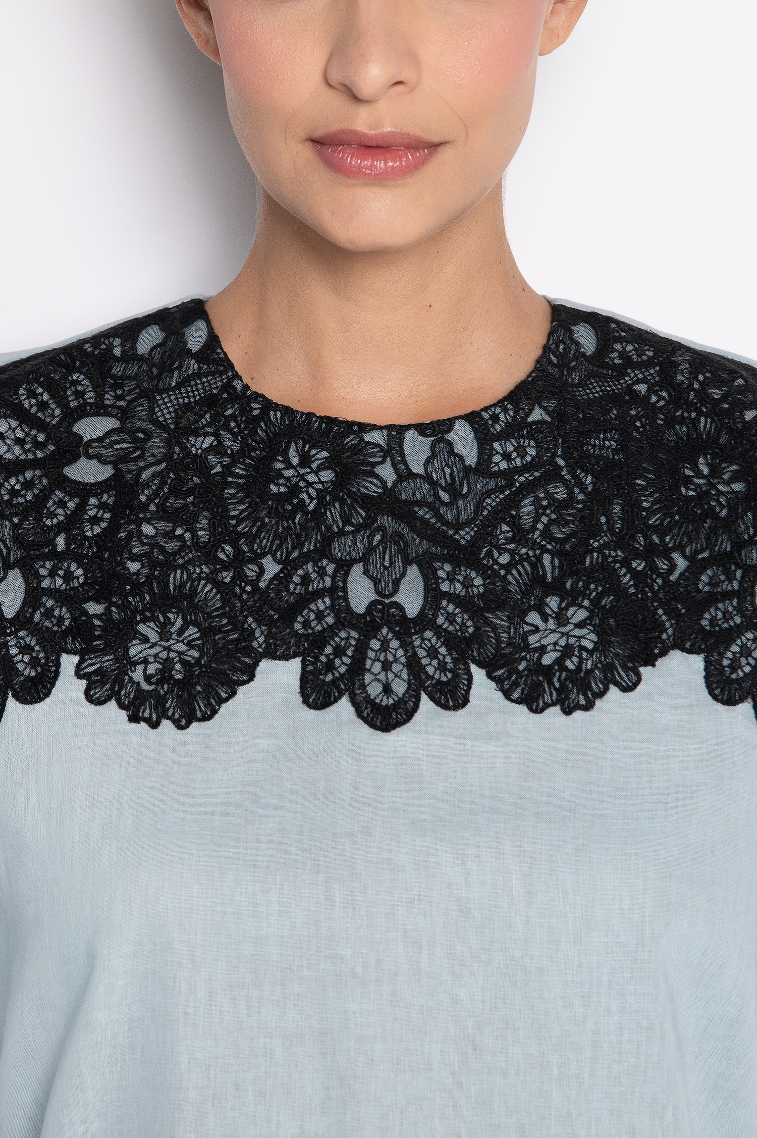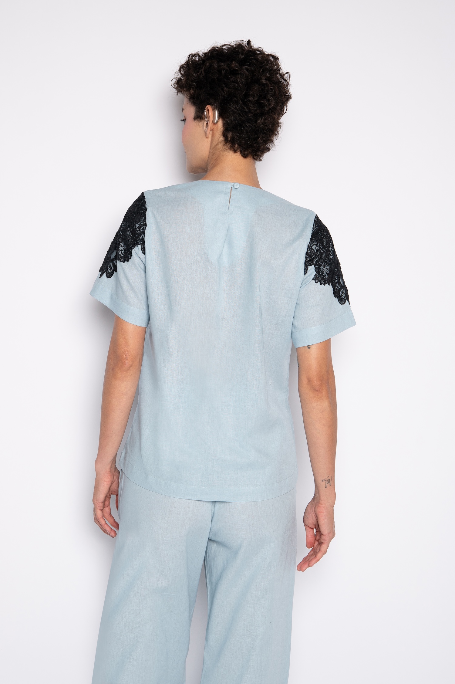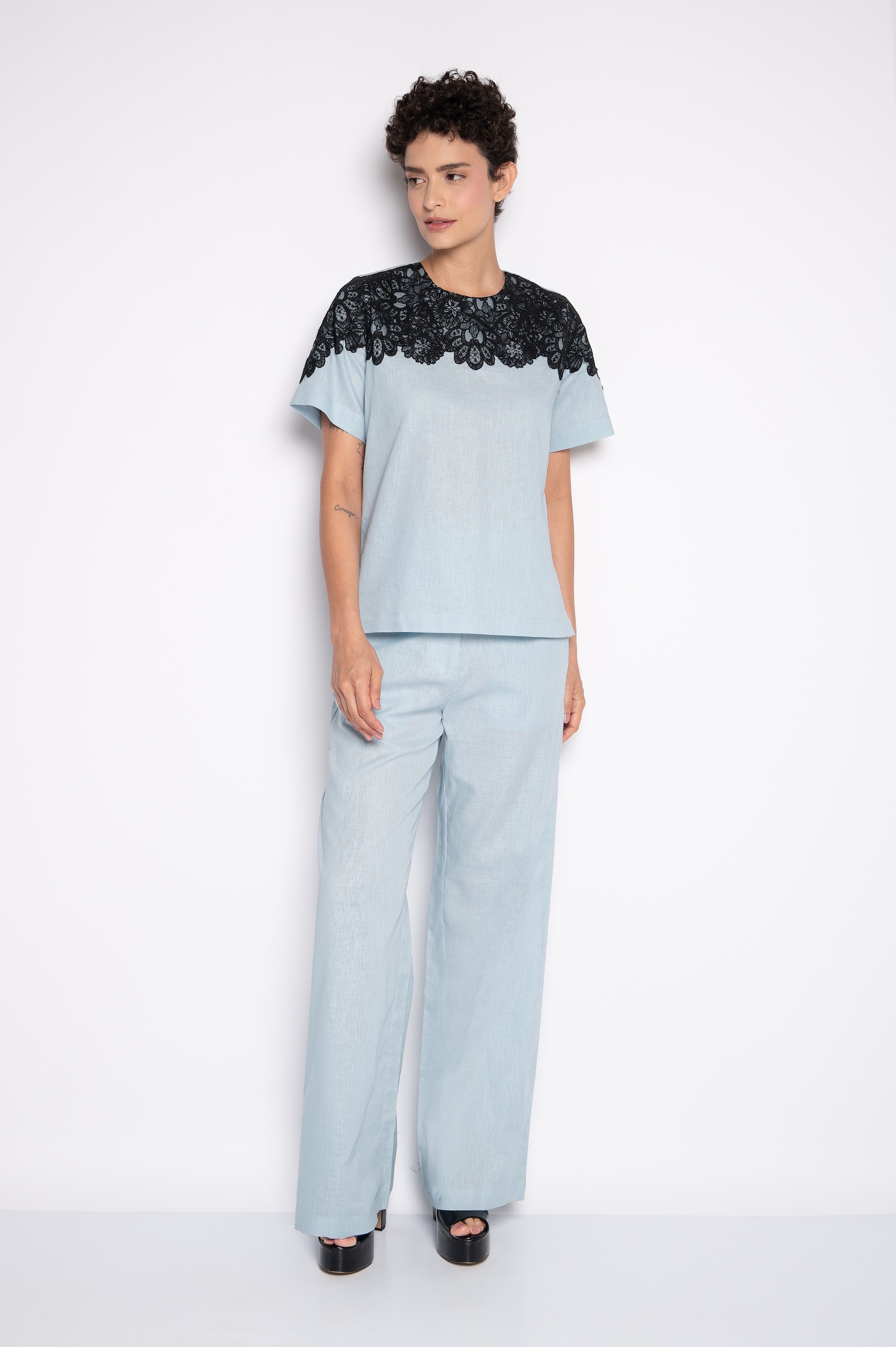 Blusa com Bordado Aplicado Manga Curta Azul Claro – Carmem