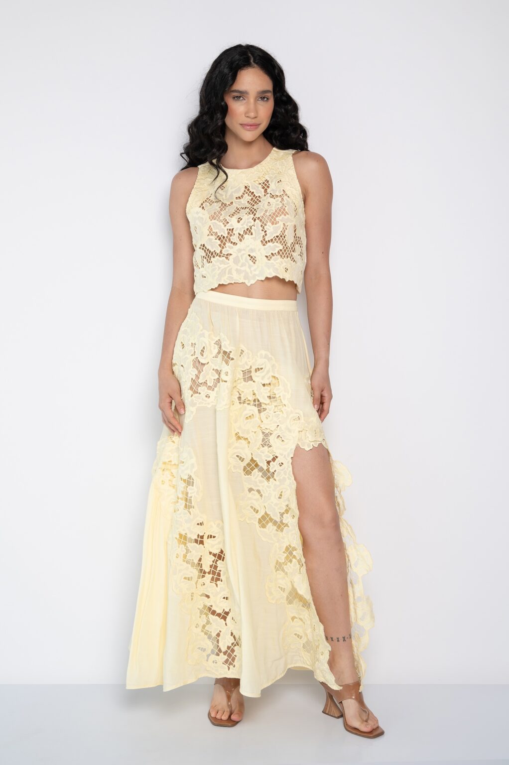 A blusa cropped bordada cavada é produzida em tecido leve, que garante conforto térmico e liberdade de movimento durante todo o dia.