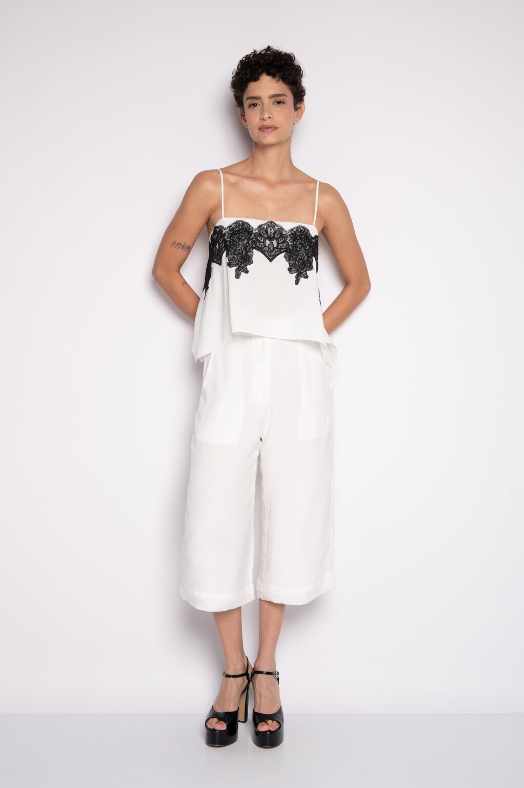 A blusa cropped bordada com alças cria um visual leve para dias quentes. Entretanto, também funciona em propostas noturnas sofisticadas.