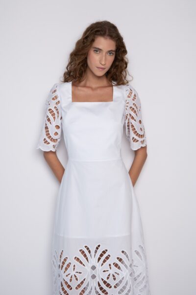 O caimento da peça é pensado para valorizar o corpo sem perder o conforto. O decote quadrado e as mangas curtas criam harmonia e equilíbrio, destacando a feminilidade de maneira natural. Essa combinação garante um visual elegante e contemporâneo.