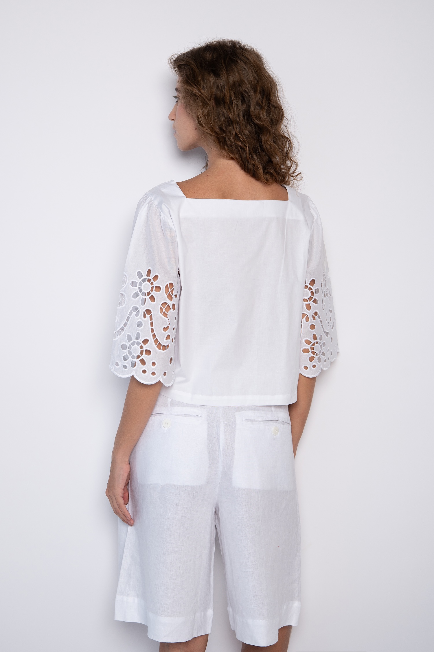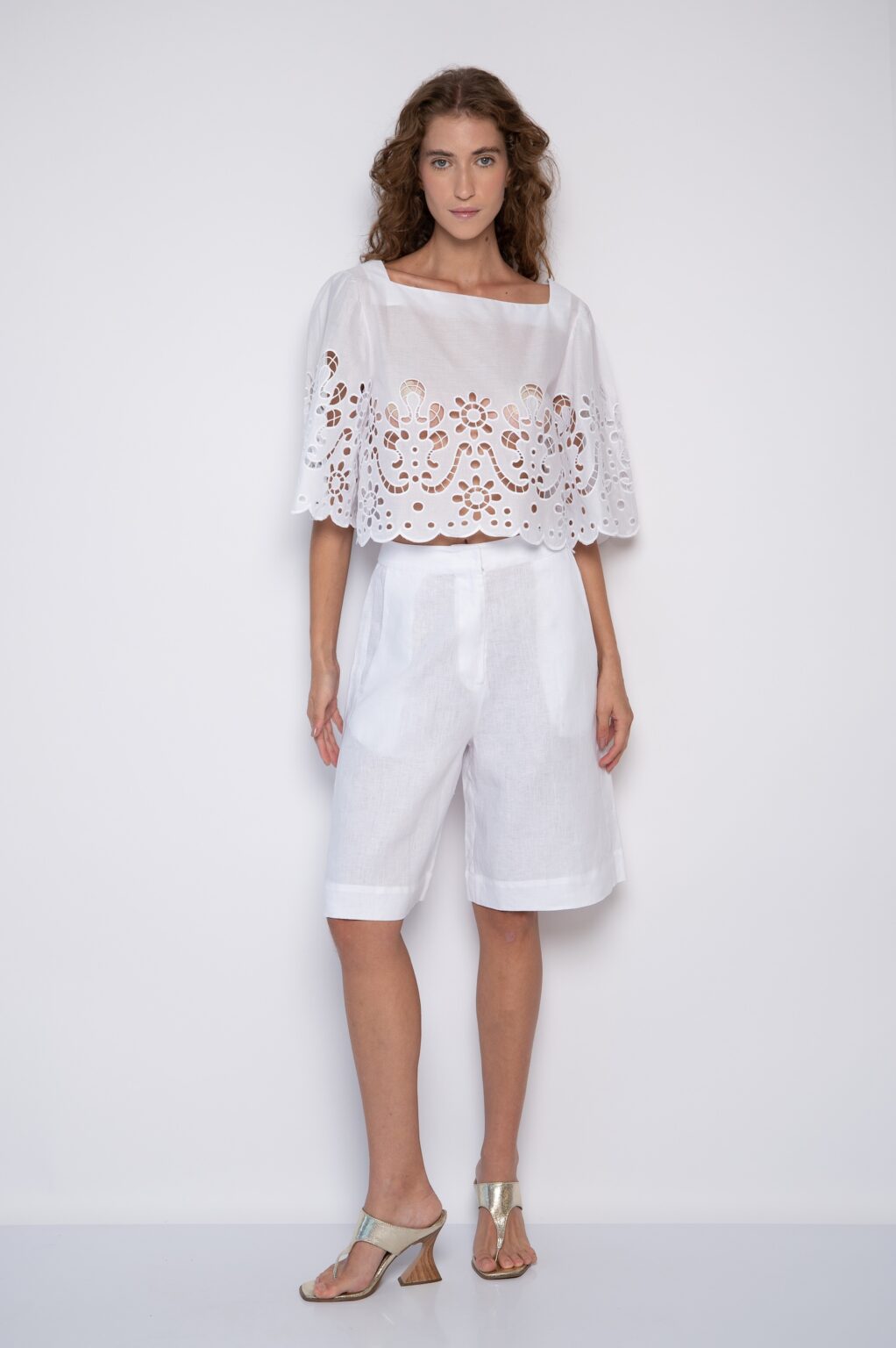 O tecido leve proporciona frescor, sendo perfeito para dias quentes. Além disso, a modelagem cropped permite combinações modernas com saias, calças ou shorts de cintura alta. Dessa forma, é fácil montar looks versáteis e estilosos com um toque sofisticado.