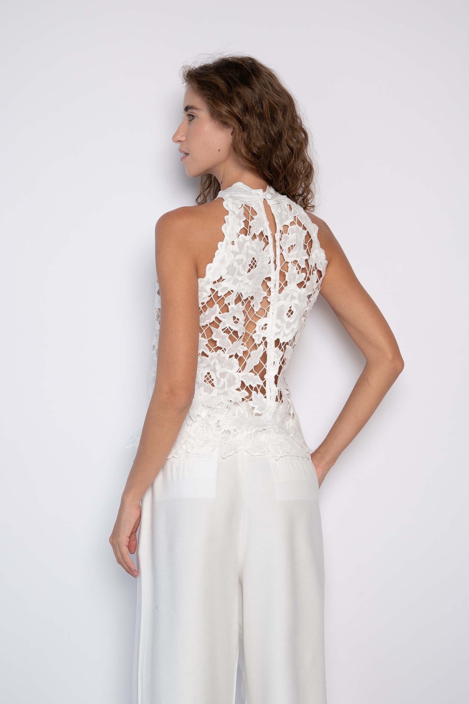 Blusa Cropped Bordado Vazado com Gola Alta Off White – Poliana