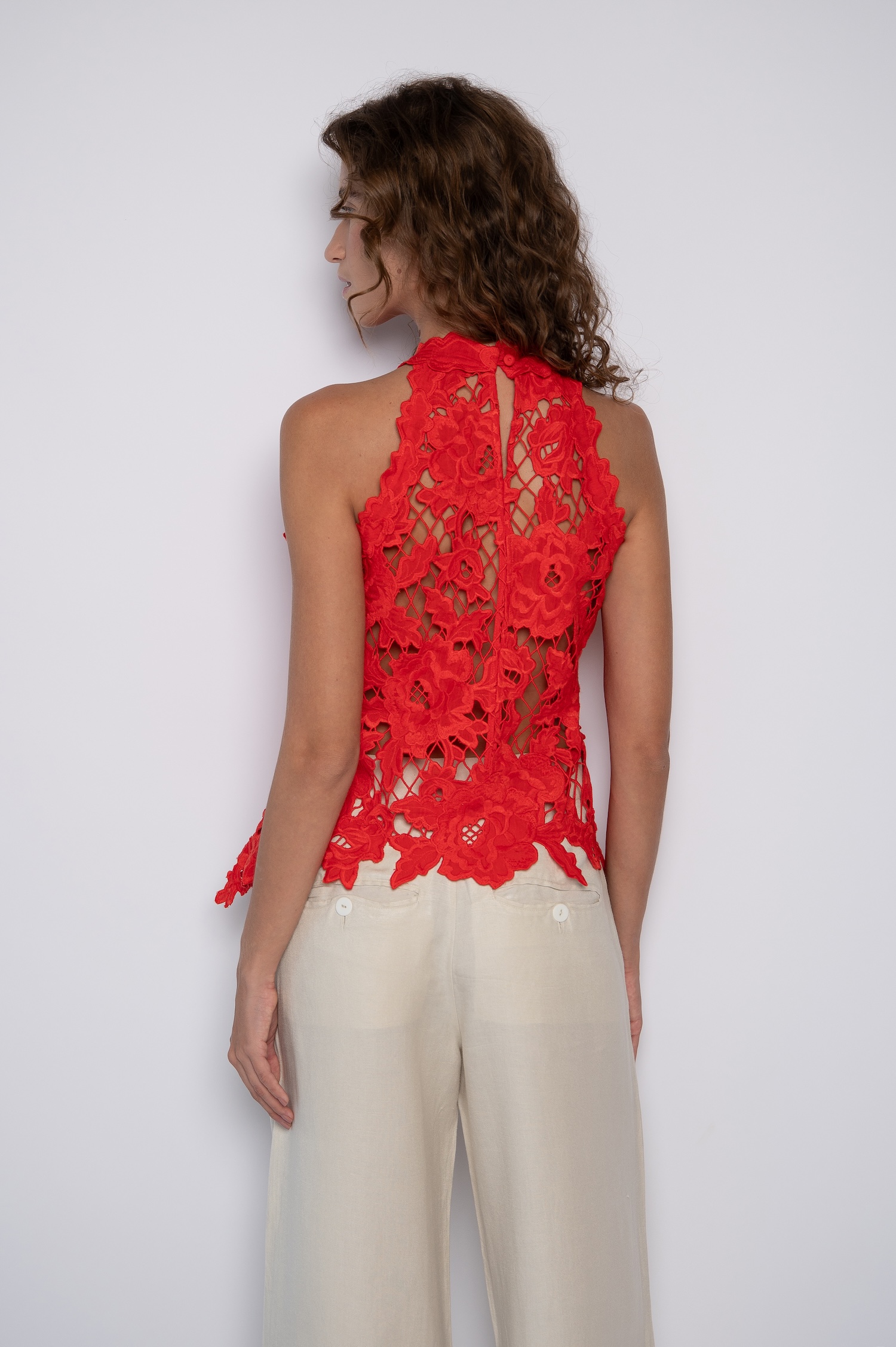 Blusa Cropped Bordado Vazado com Gola Alta Vermelha – Poliana