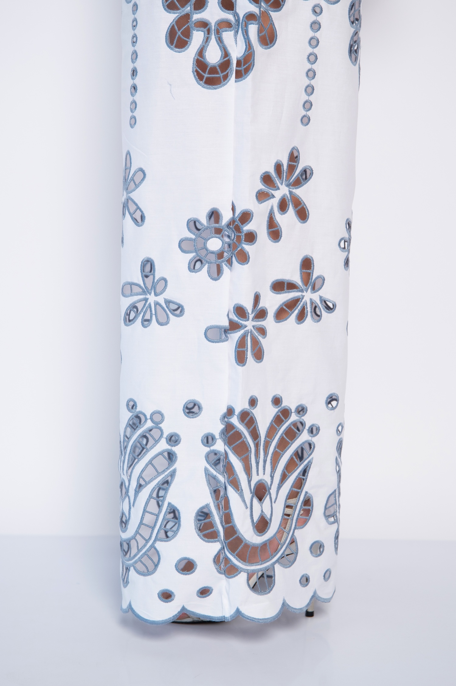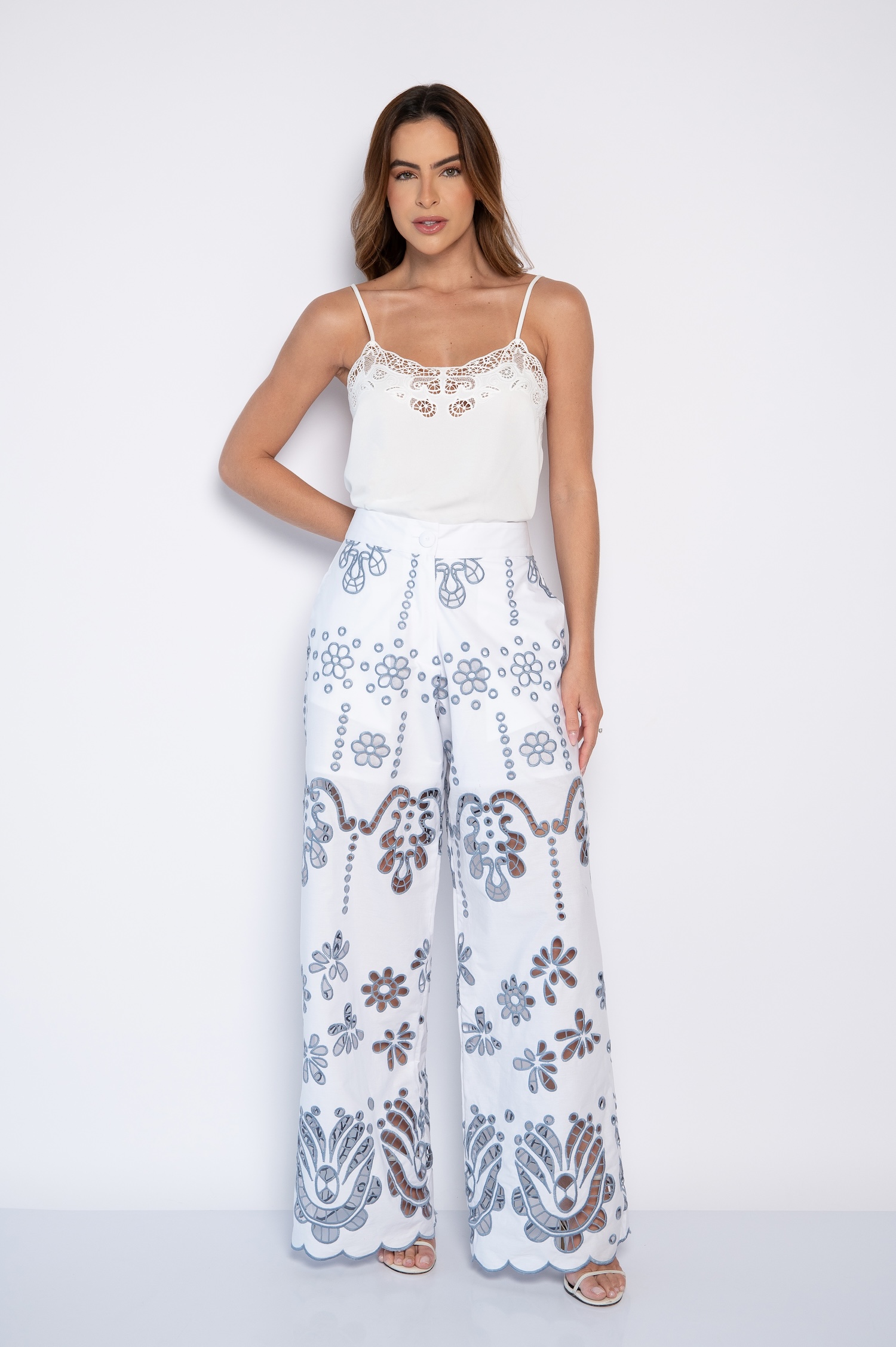 Calça Pantalona Bordada Branca/Azul – Lorena