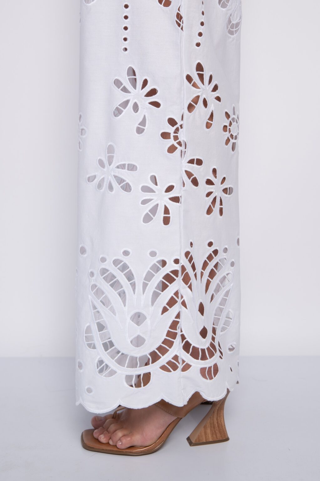 Com bordados delicados e acabamento refinado, essa calça traduz elegância em cada detalhe. O fechamento frontal com botão e zíper garante praticidade e ajuste perfeito ao corpo.