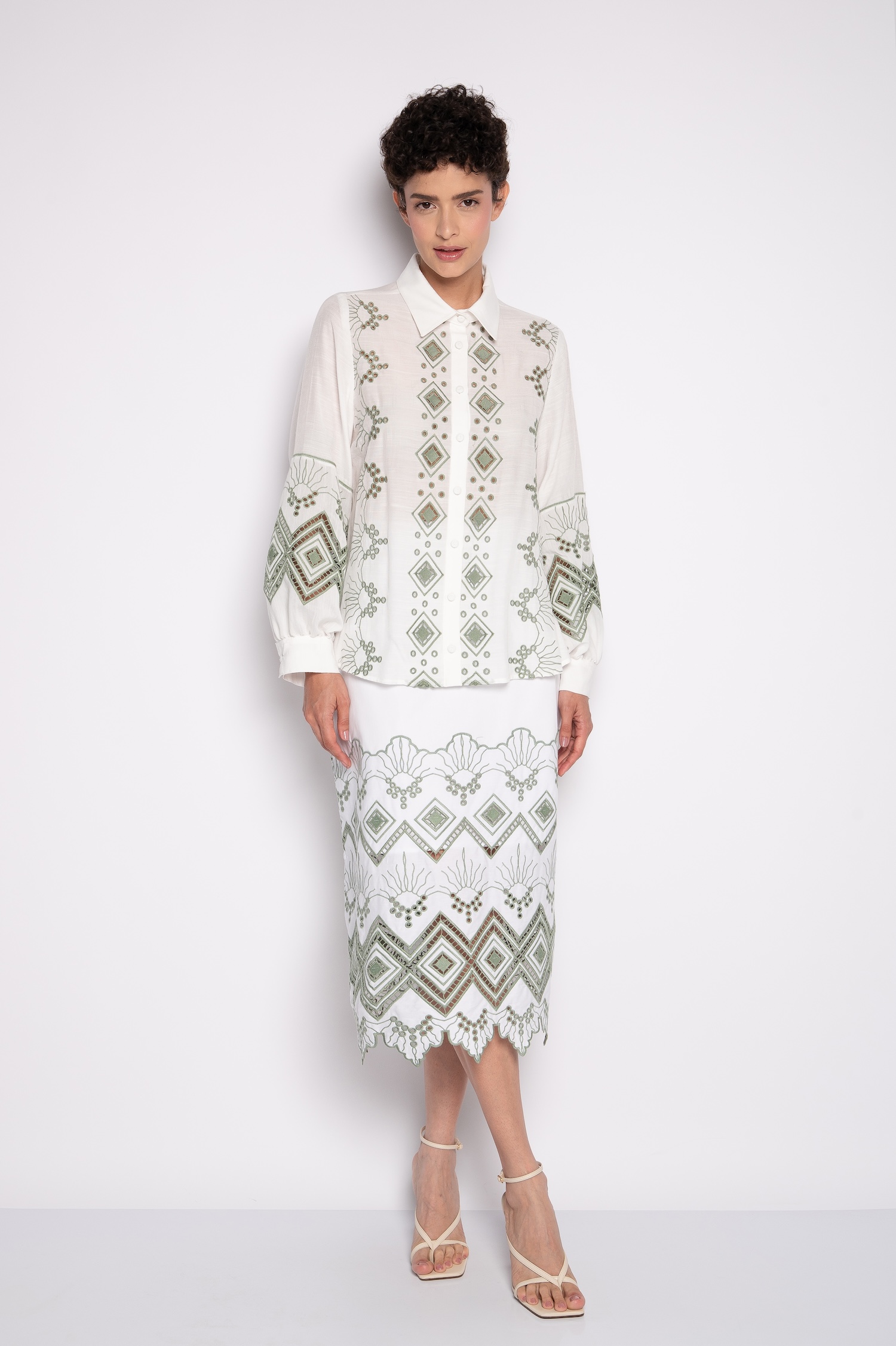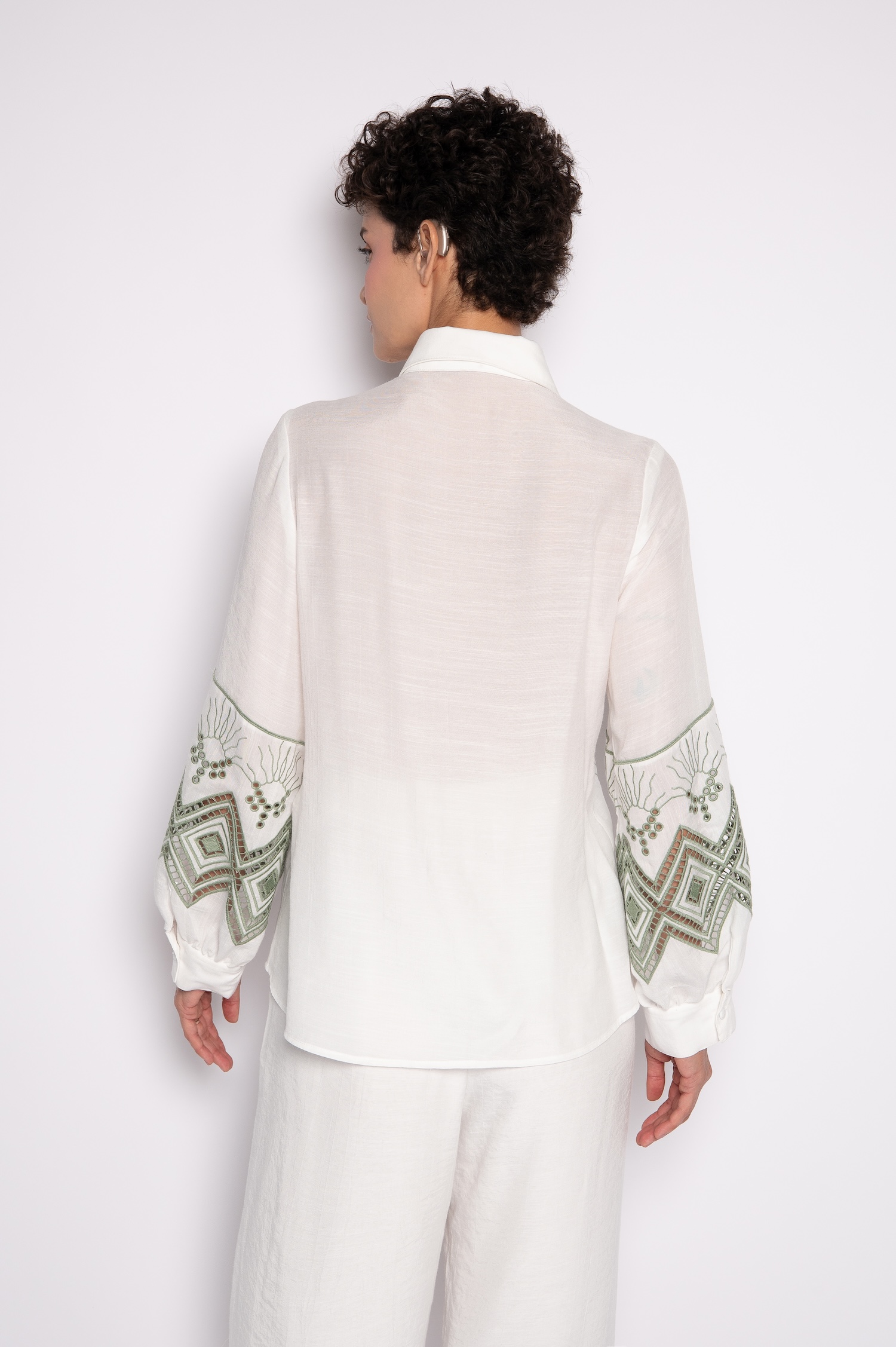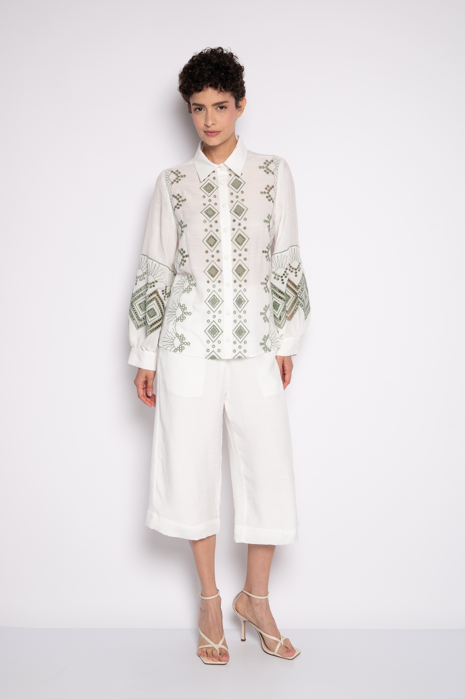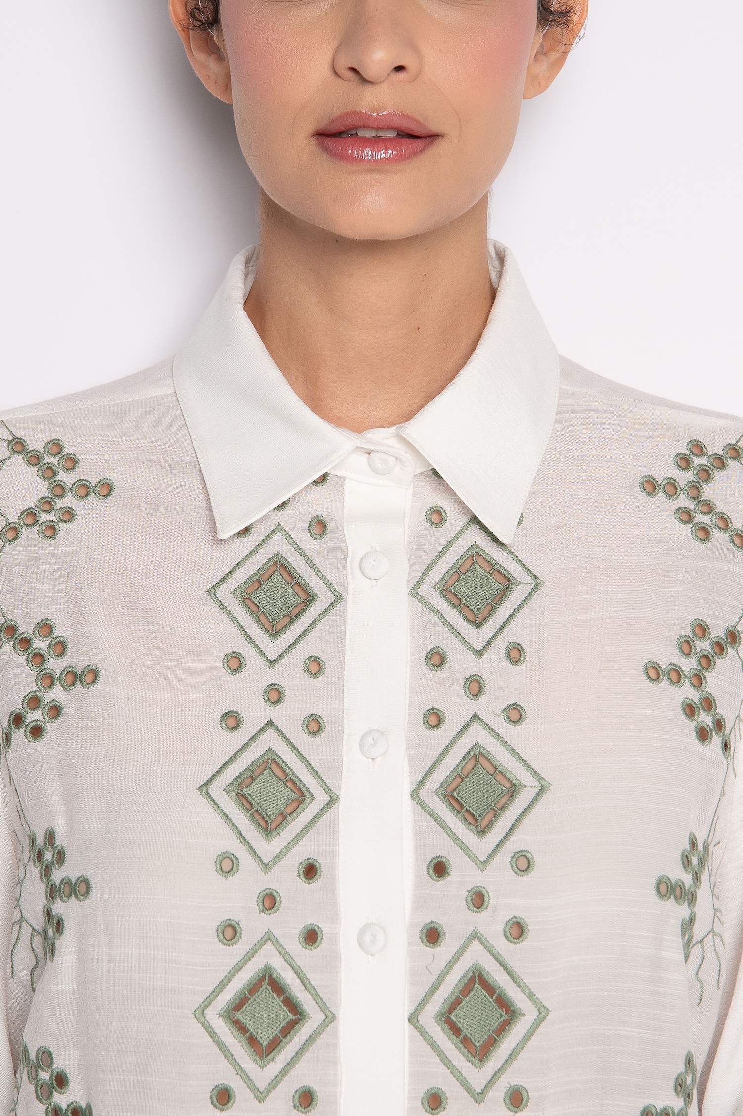 Camisa Bordada com Gola Tradicional e Manga 7/8 Bufante Off White – Tânia