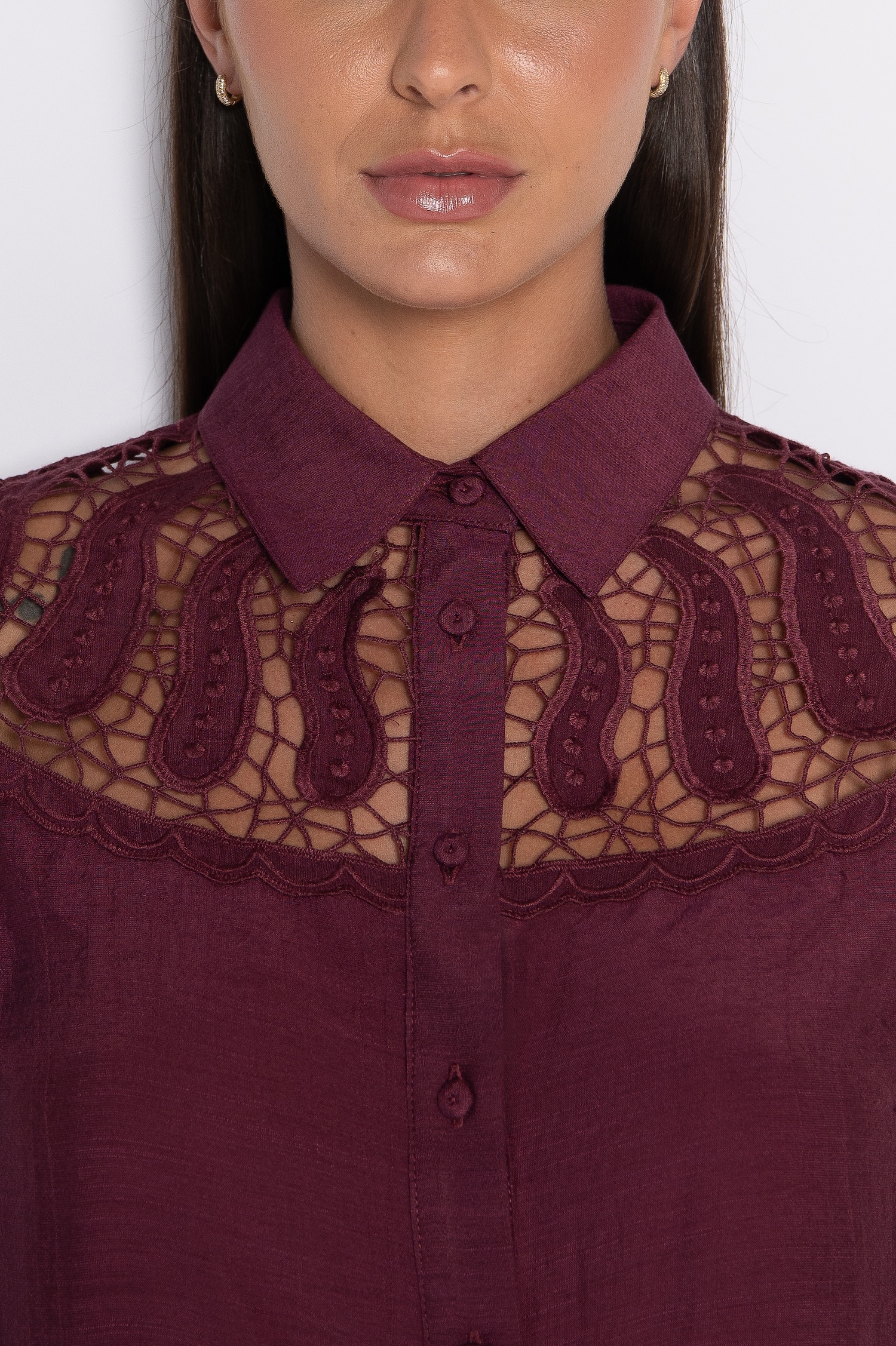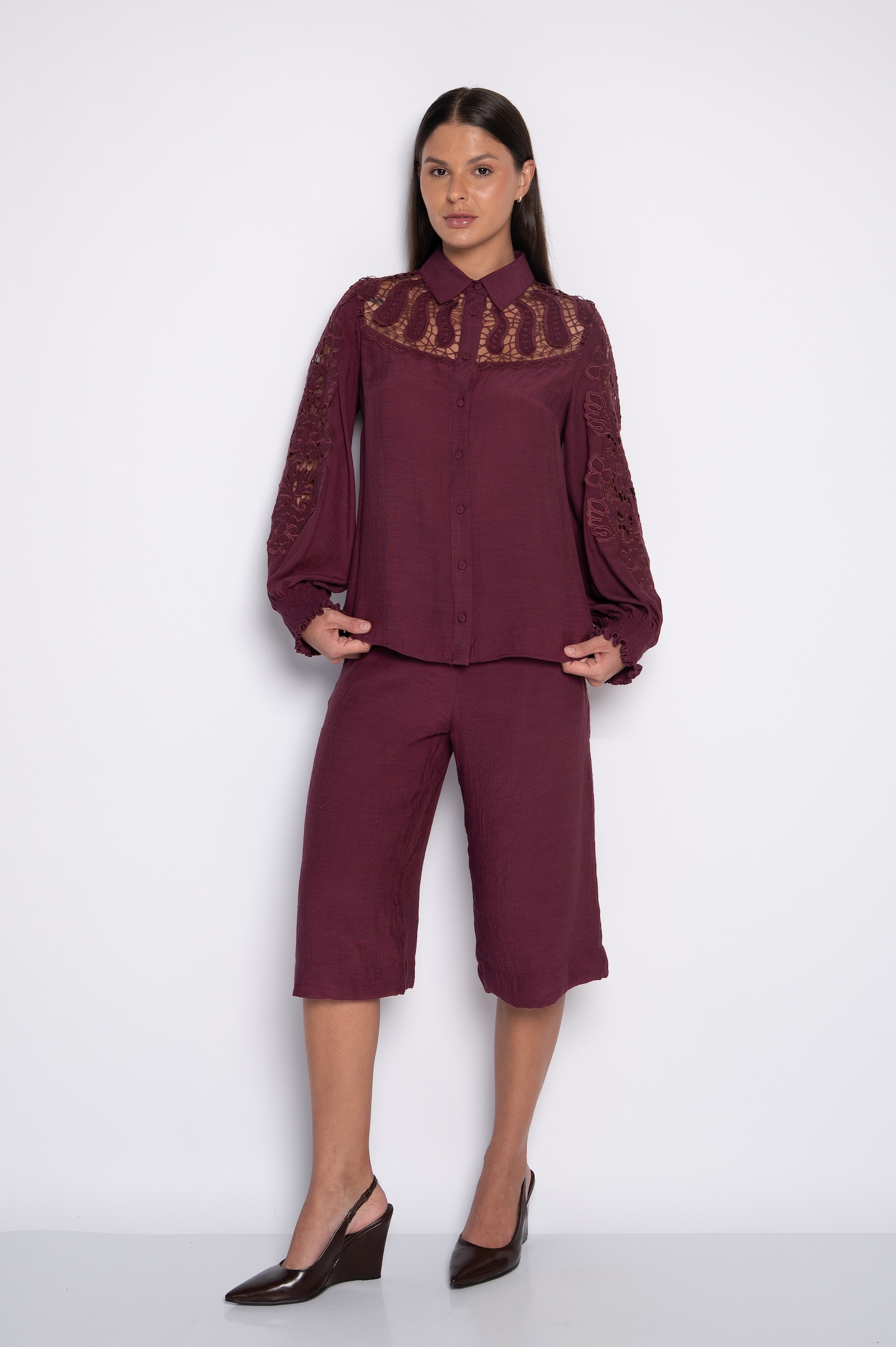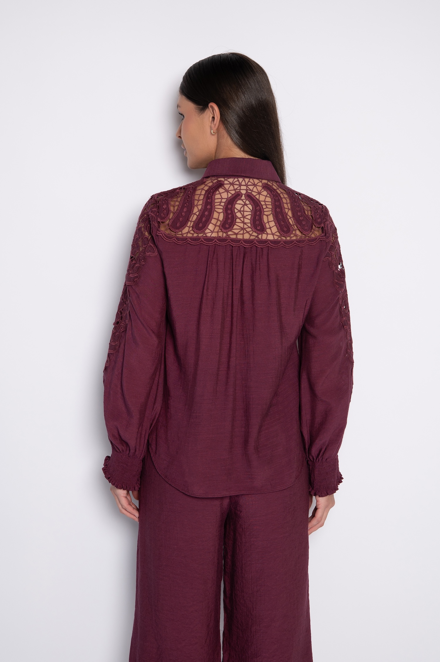 Camisa Bordada com Lastex nos Punhos Vinho – Zenilda