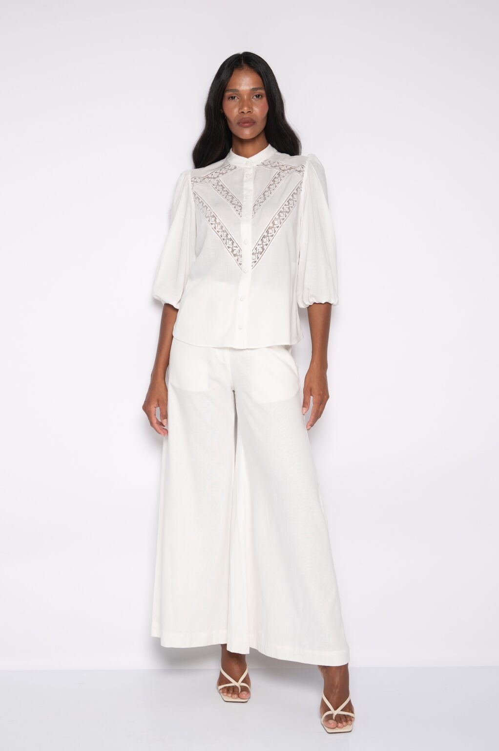 Primeiramente, a camisa bordada com manga 3/4 destaca-se pelos bordados delicados.