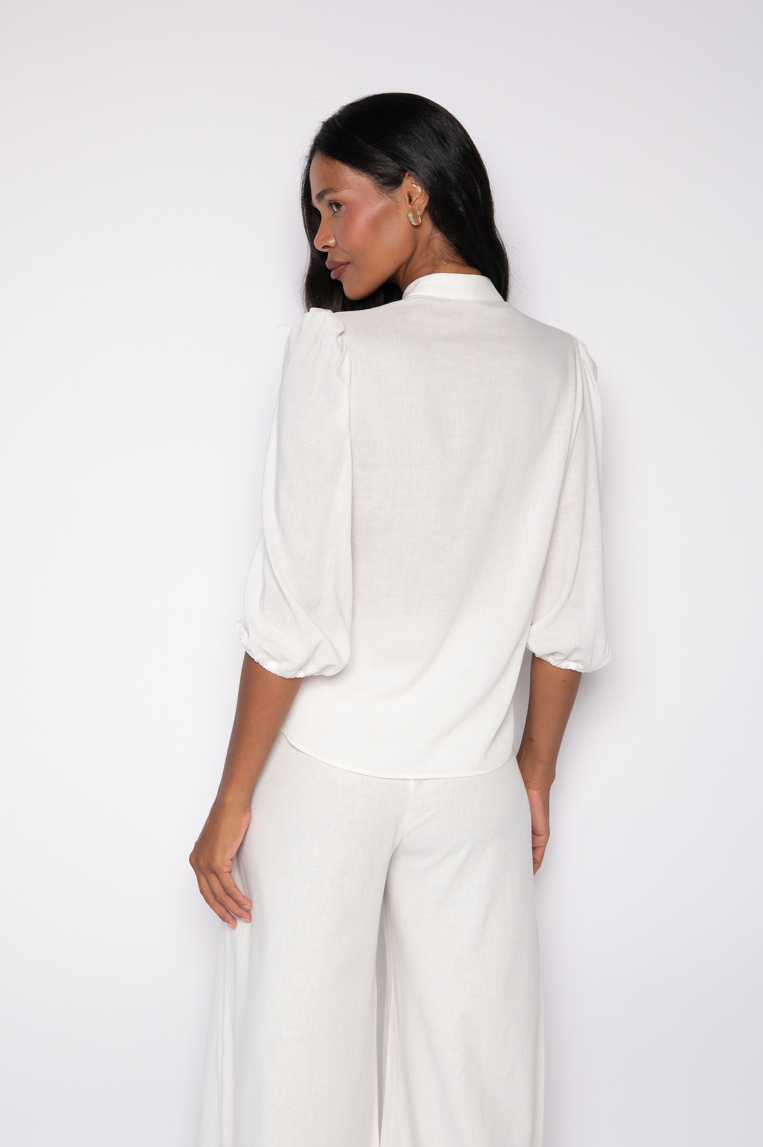 Por fim, a camisa bordada manga 3/4 com mangas bufantes une conforto, estilo e elegância.