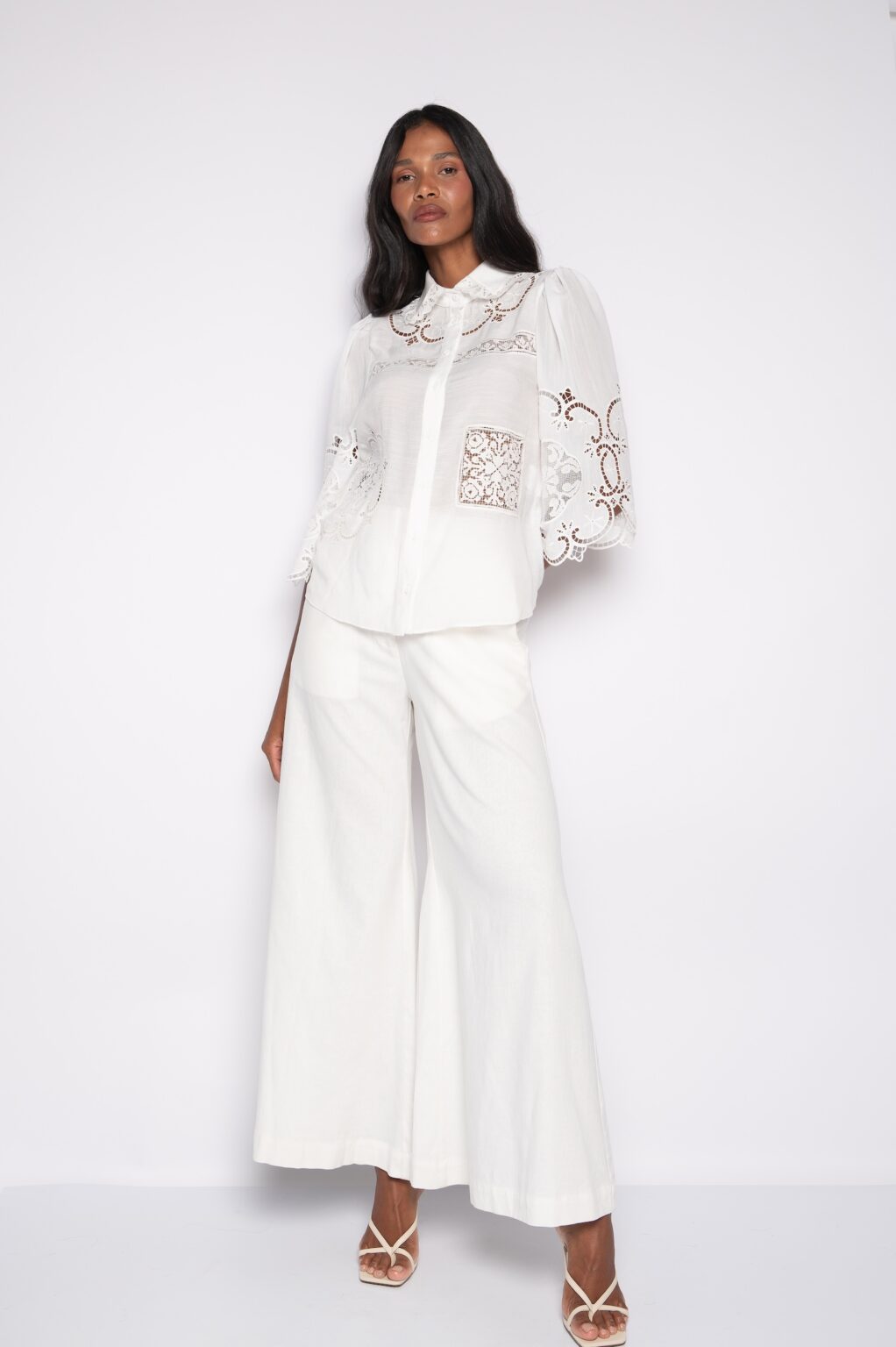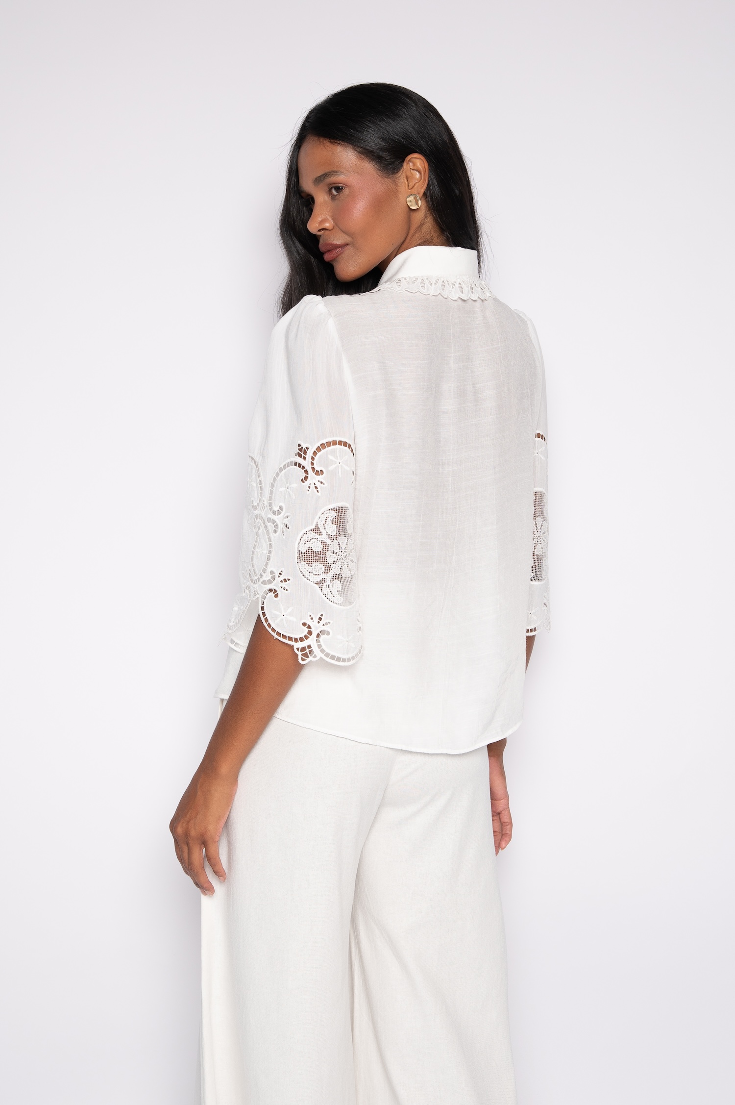Primeiramente, a camisa bordada com manga 7/8 apresenta bordados delicados, criando identidade visual refinada.
