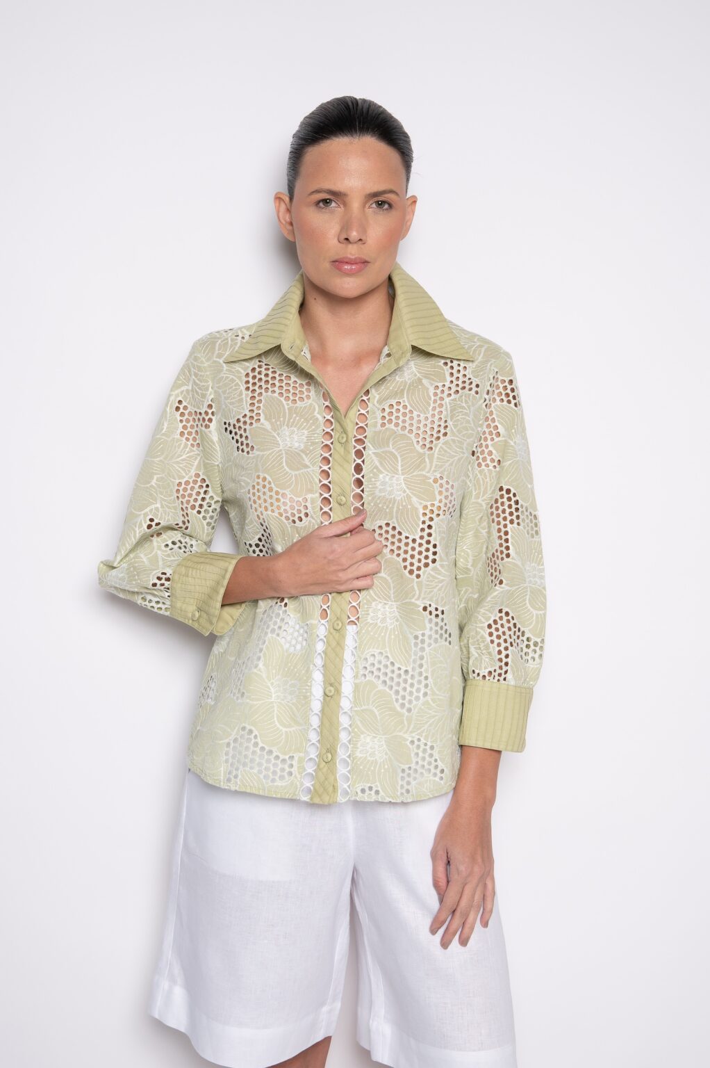 Camisa Bordada com Mangas 3/4 e Gola Tradicional Capim Limão – Rafaella
