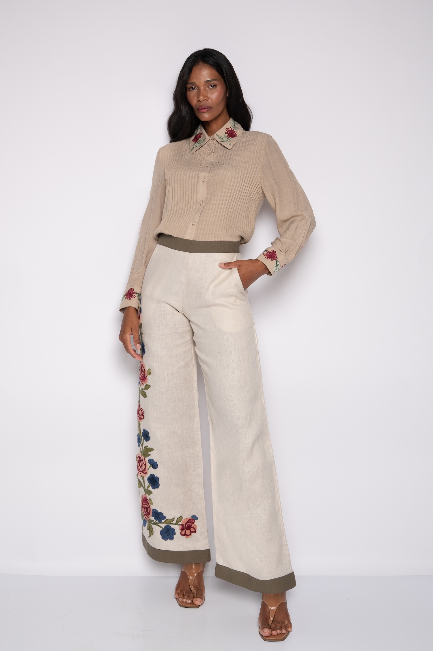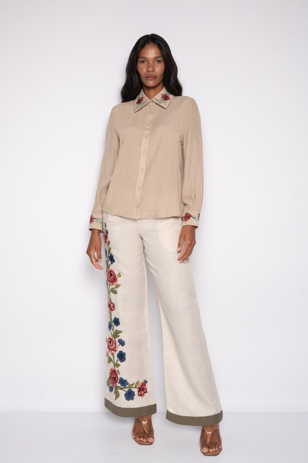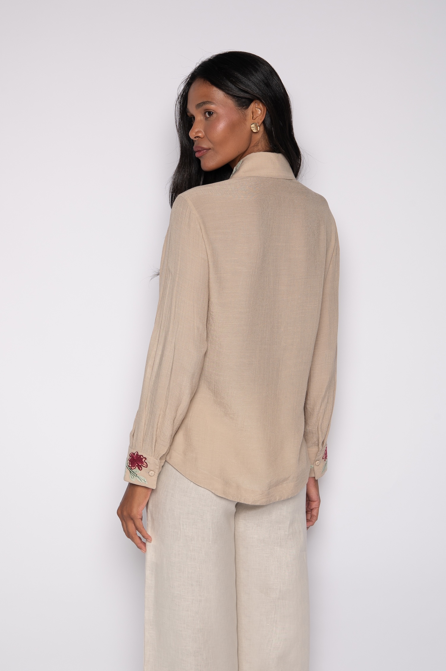 De forma complementar, a camisa bordada com nervuras e manga 7/8 expressa atenção aos detalhes.