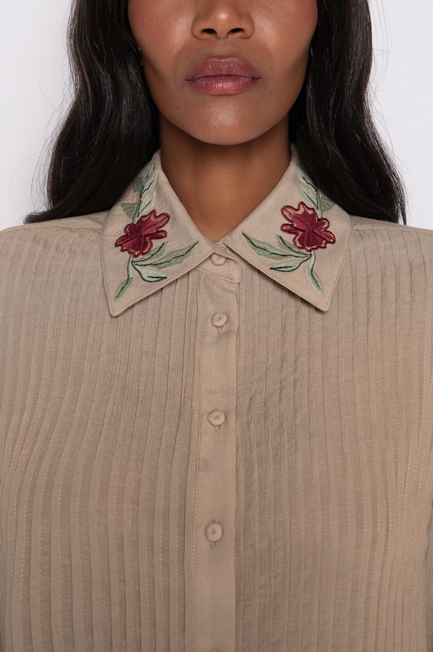 Camisa Bordada Com Nervuras e Manga 7/8 Caqui – Raquel