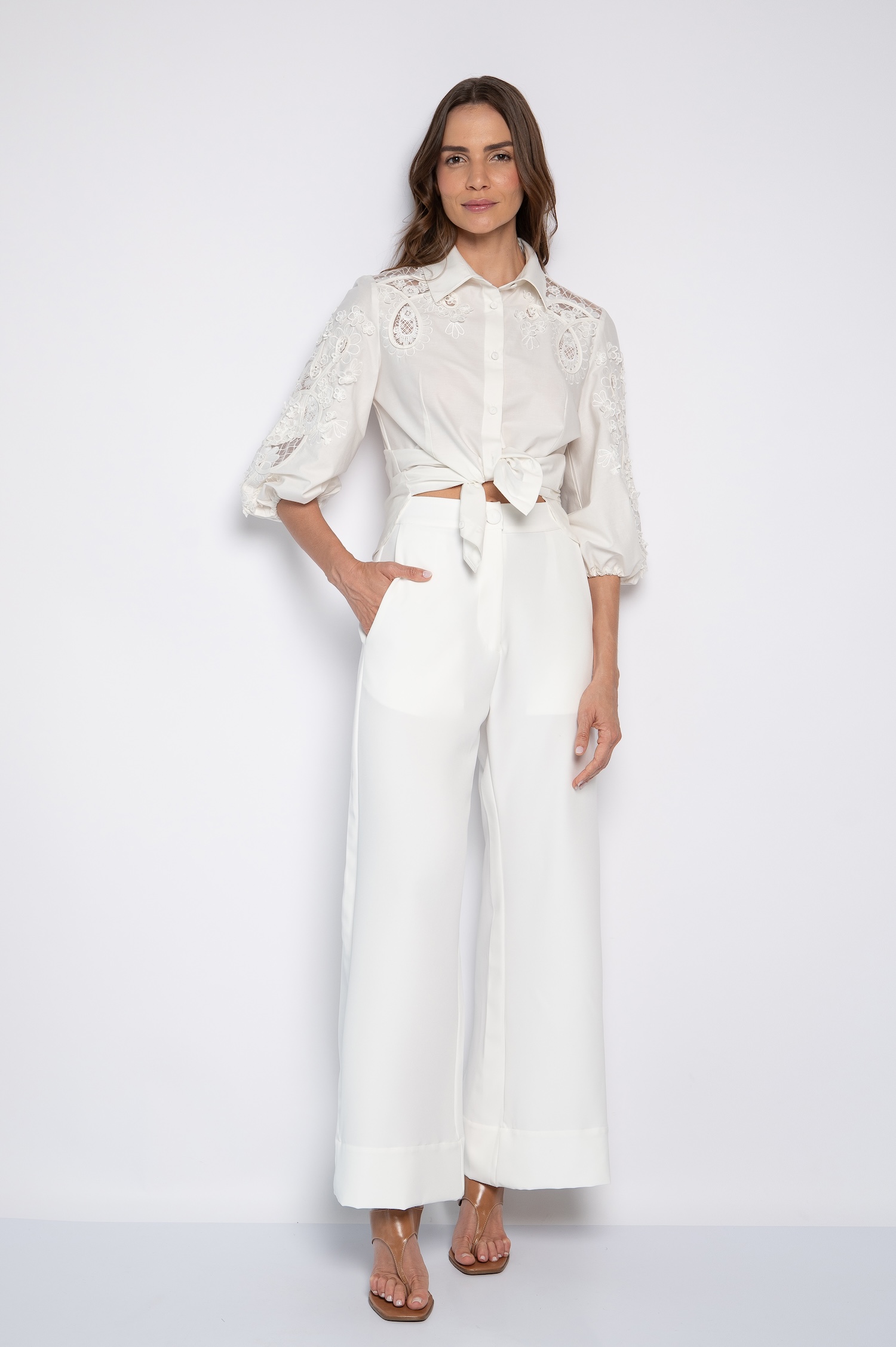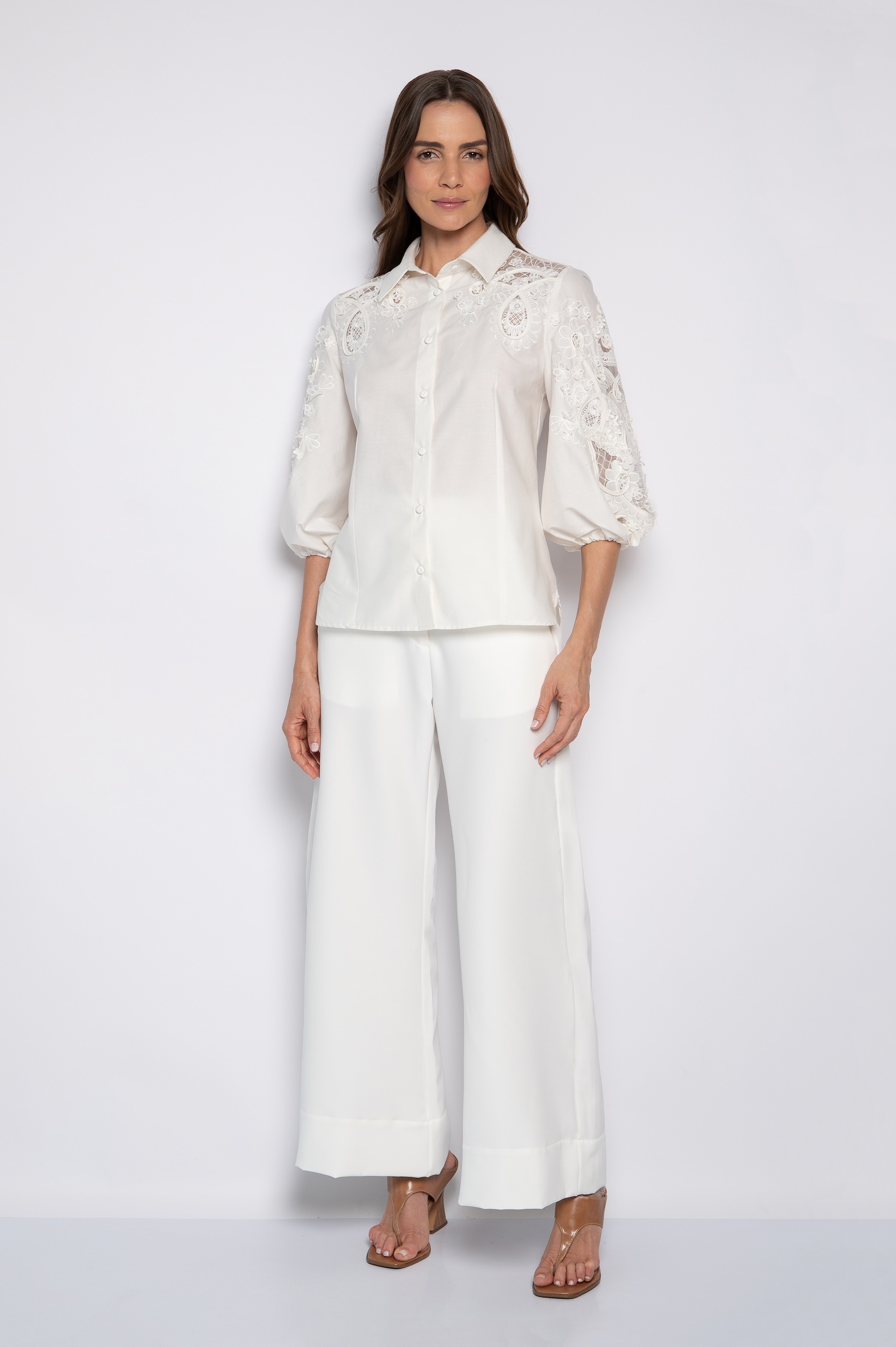A camisa bordada floral com transparência tule combina com diferentes estilos. Com calças de alfaiataria, saias ou jeans, ela transforma o look com autenticidade.