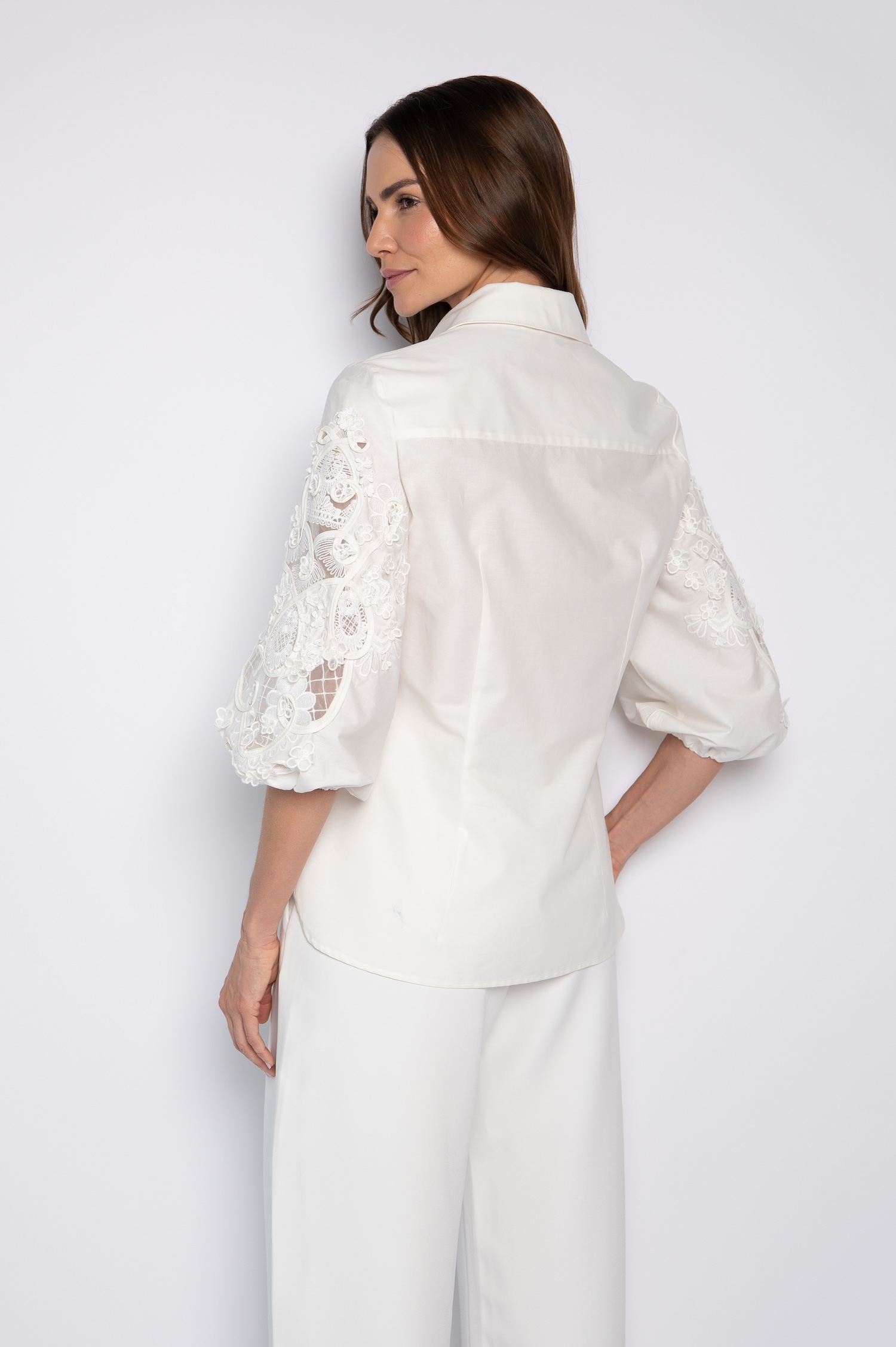 Com leve transparência em tule, essa camisa valoriza a feminilidade de forma sutil. O tule aparece delicadamente sobre ombros e mangas, equilibrando estilo e leveza.