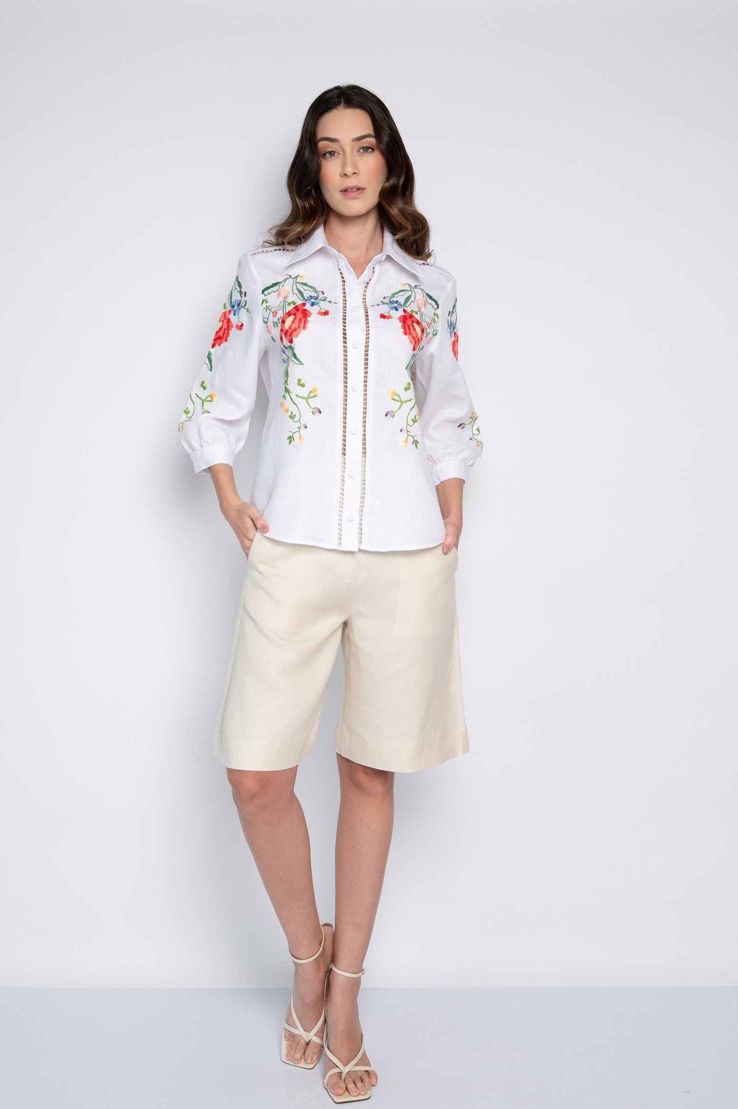 Detalhes bordados com mini florais enriquecem o visual, trazendo feminilidade e charme à peça.