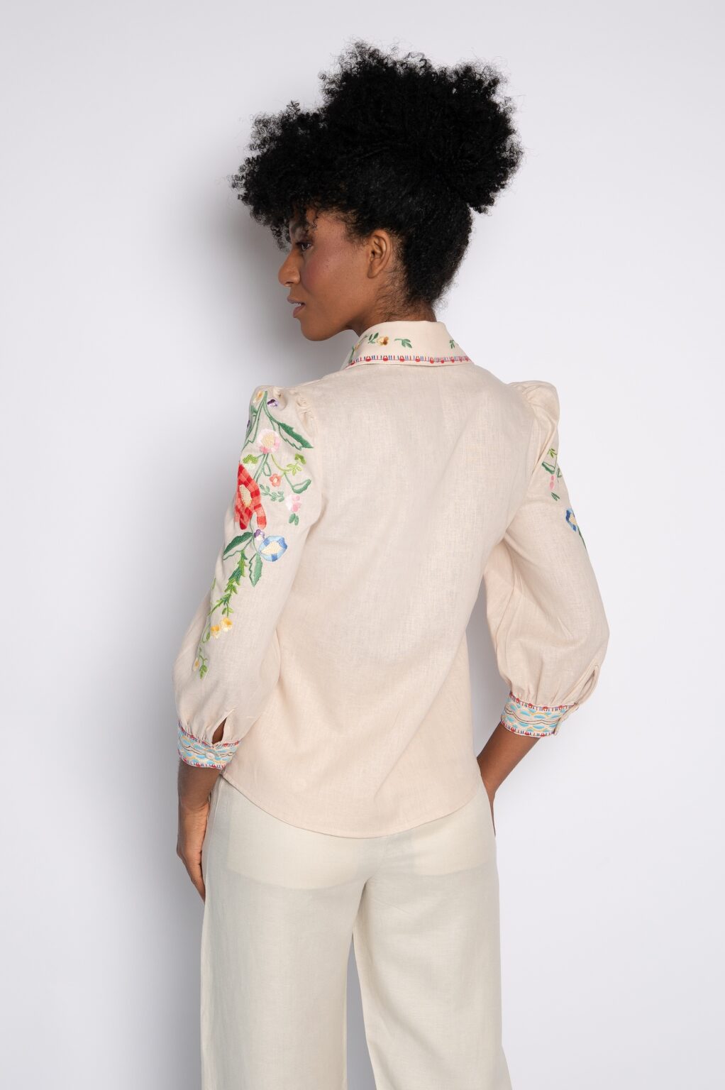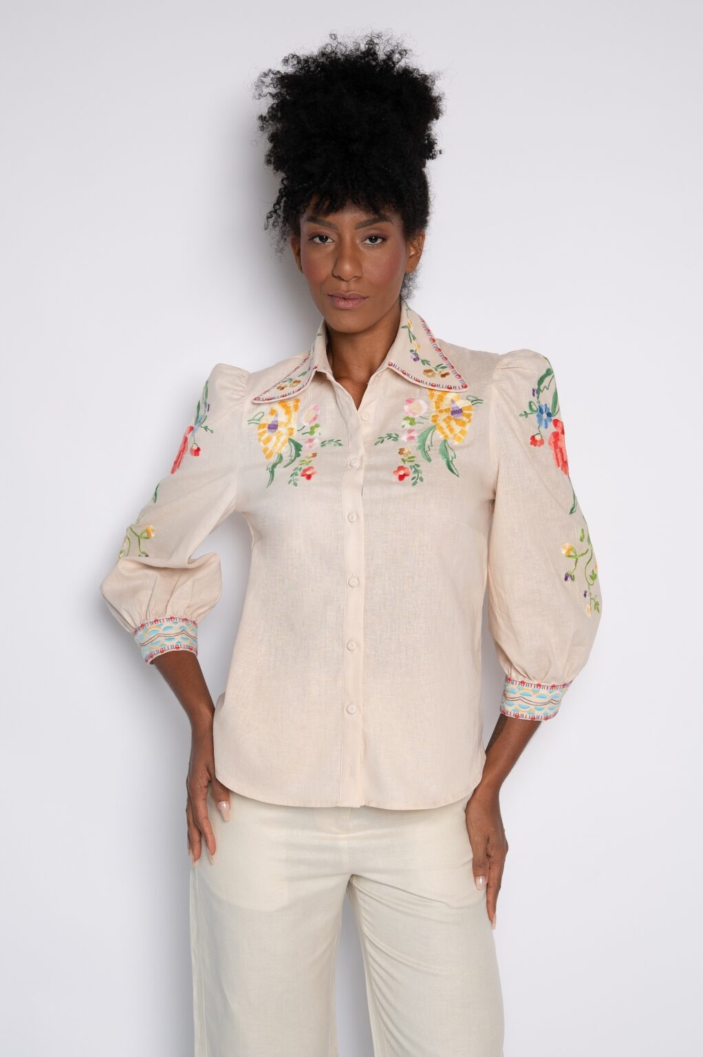 Camisa com mangas 3/4 e bordado mini florais natural – Zuleica