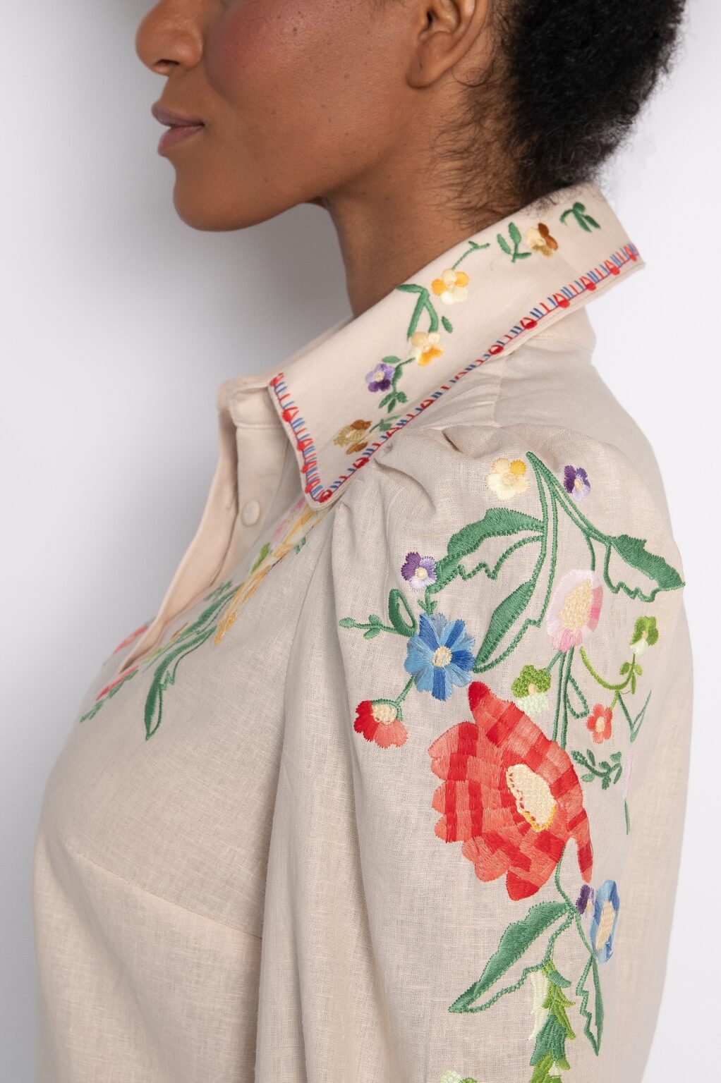 Os bordados mini florais aplicados delicadamente realçam a exclusividade da peça. Esses detalhes artesanais remetem ao romantismo, trazendo uma identidade única à camisa.