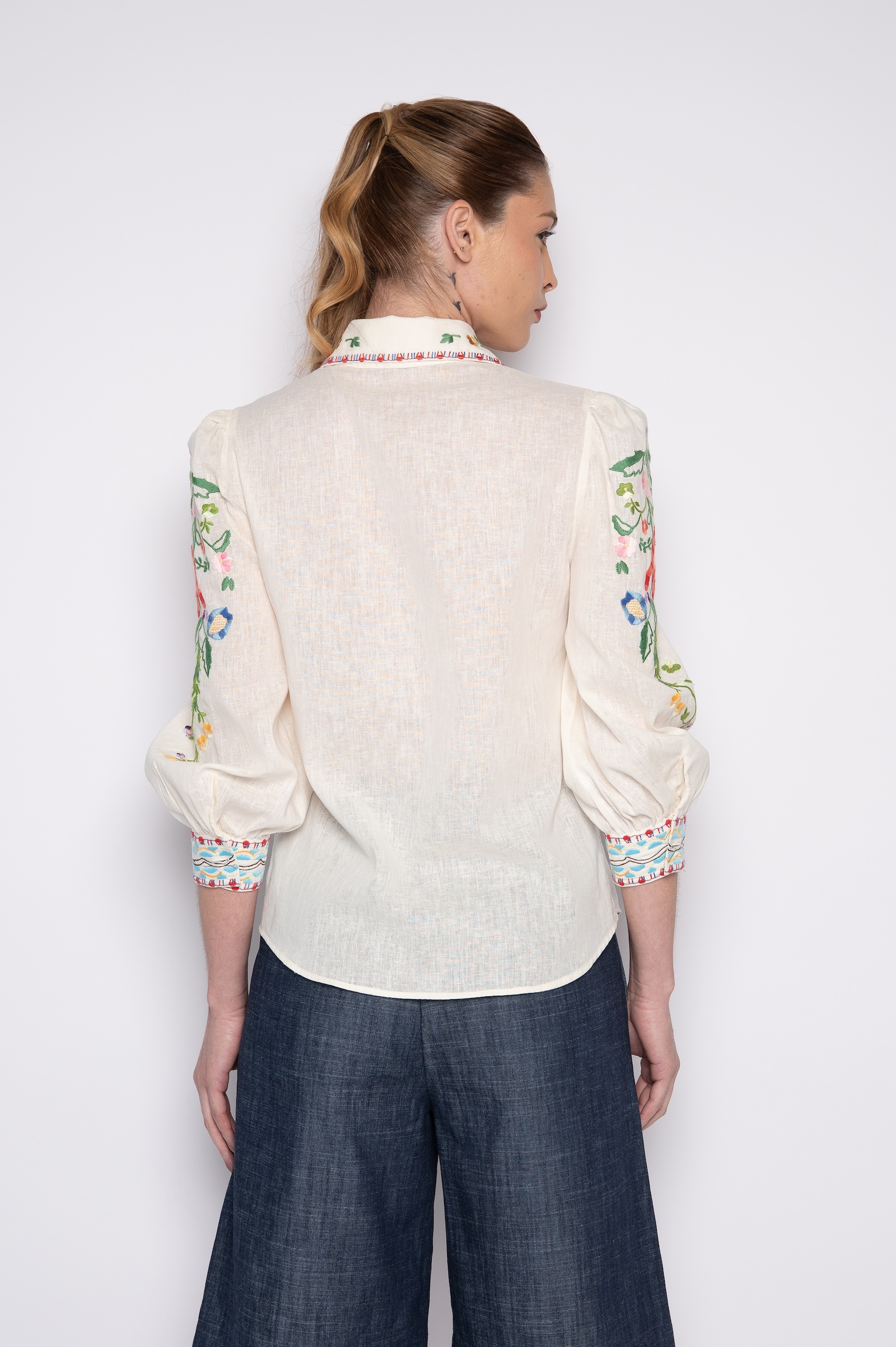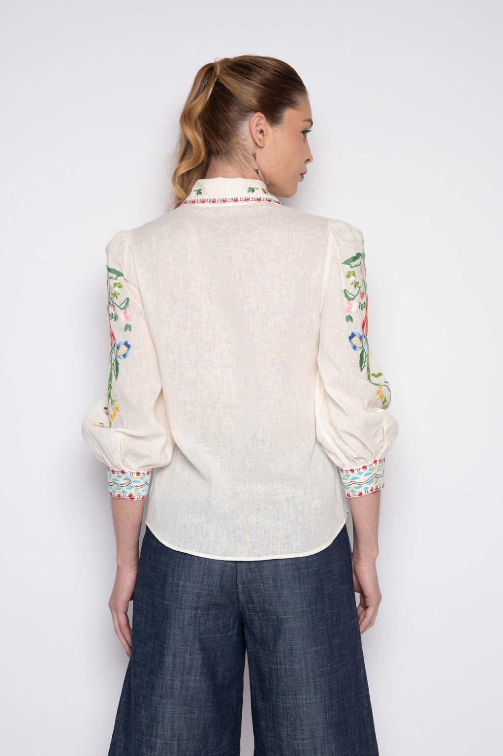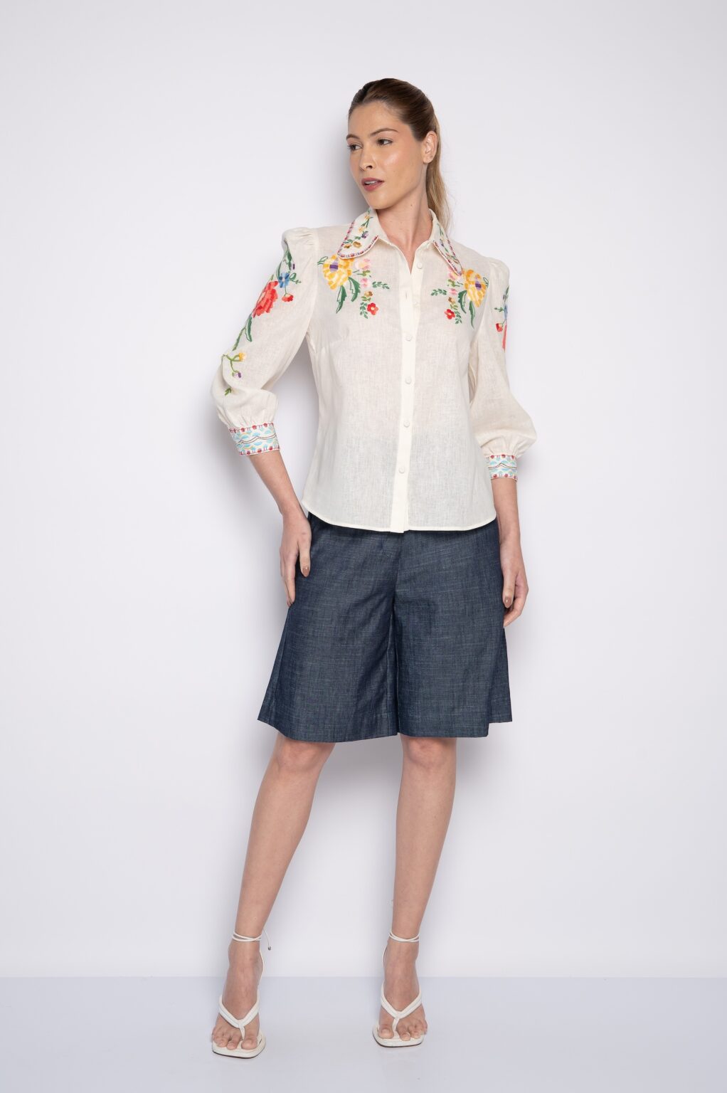 Camisa com mangas 3/4 e bordado mini florais off white – Zuleica
