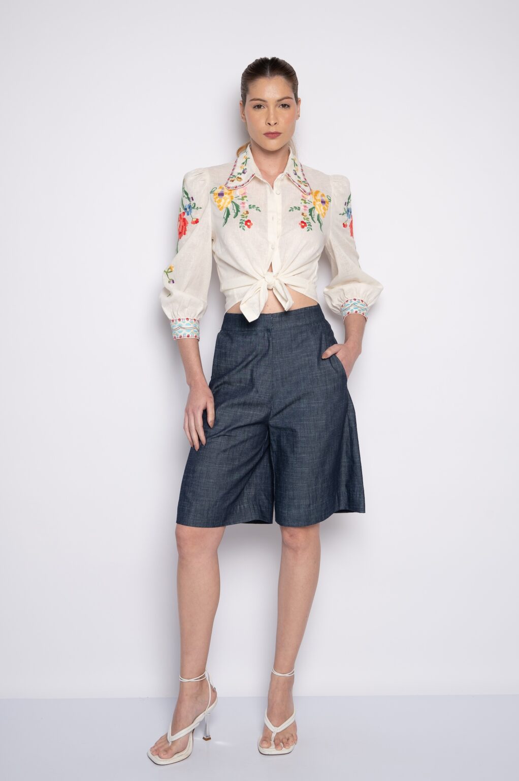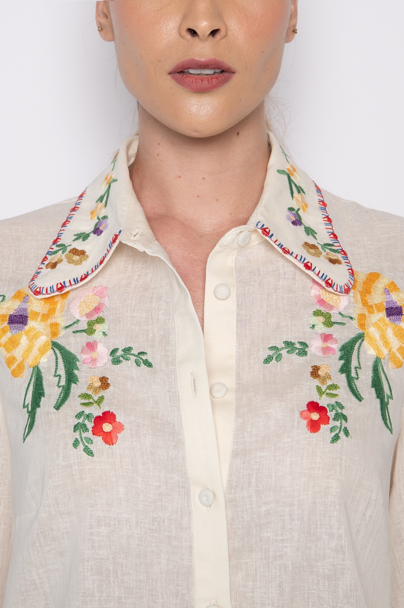 Os bordados mini florais aplicados delicadamente realçam a exclusividade da peça. Esses detalhes artesanais remetem ao romantismo, trazendo uma identidade única à camisa.