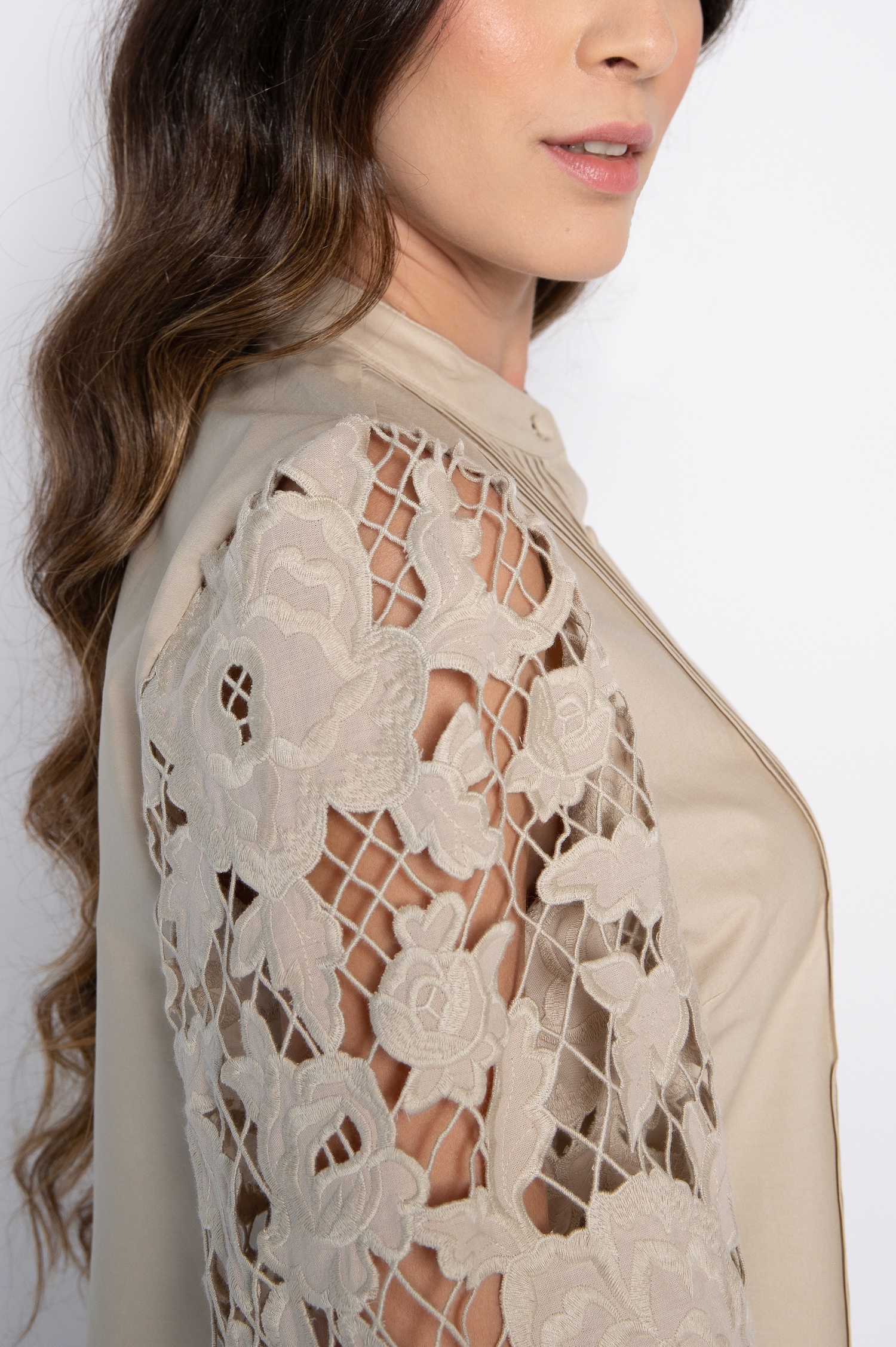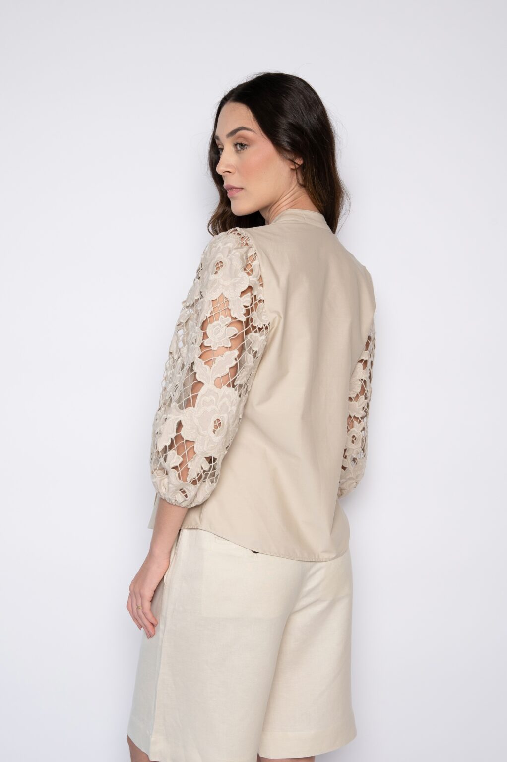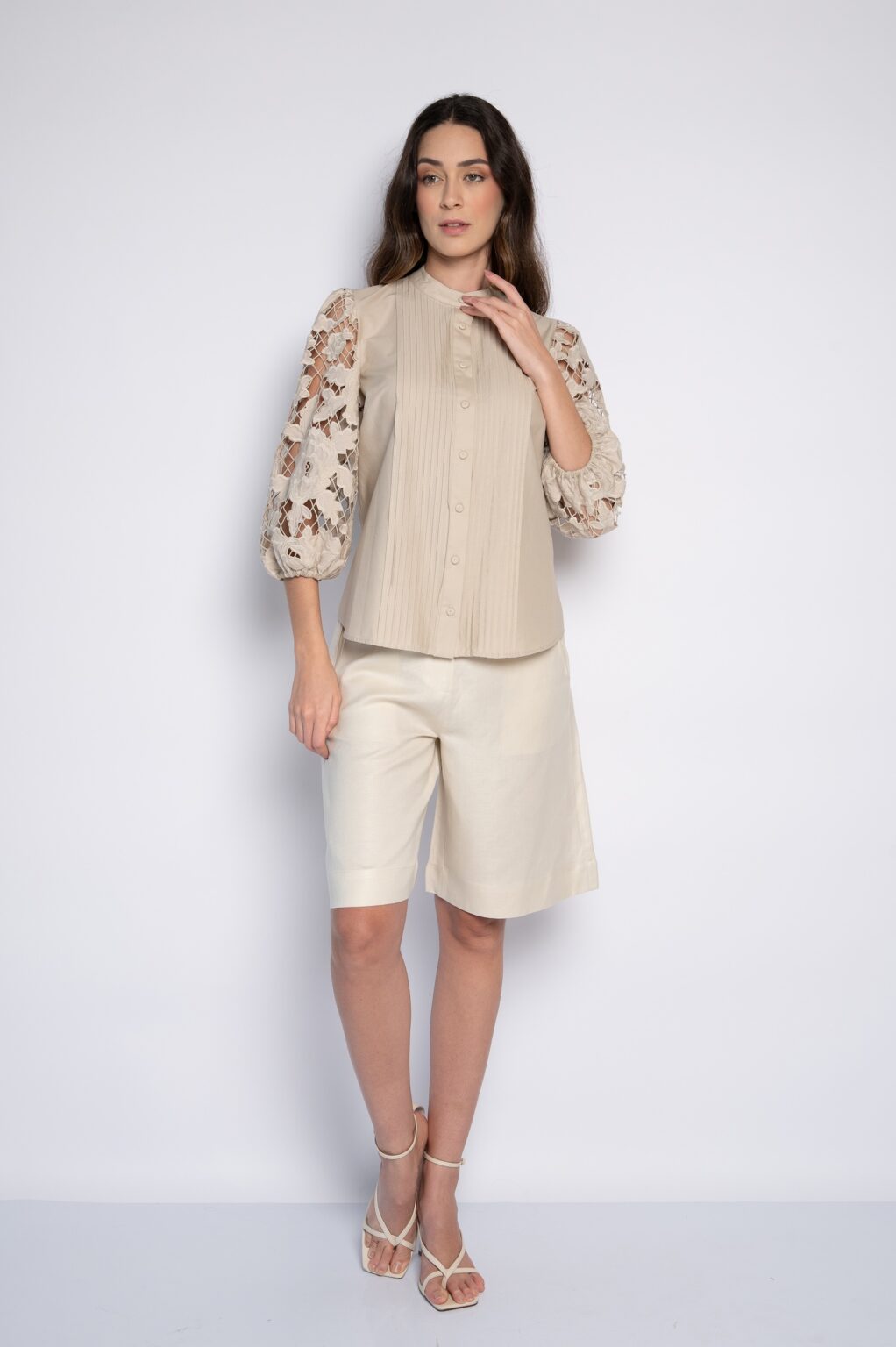 Camisa com Mangas Bordadas e Nervuras Frontais Bege – Zilda