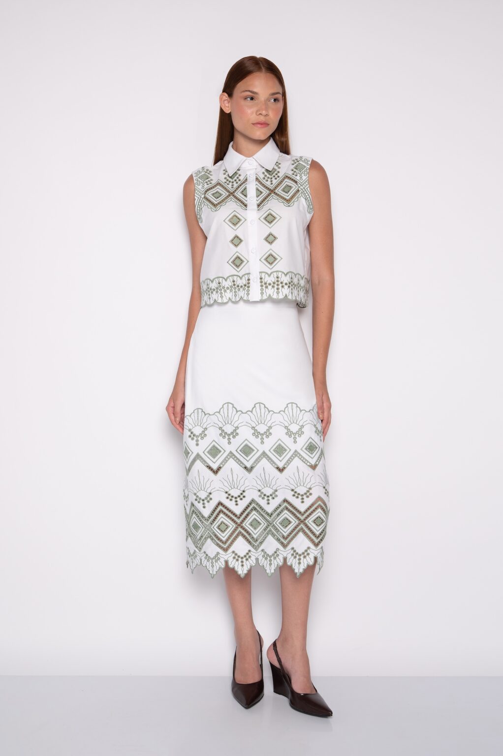 A camisa cropped bordada apresenta gola tradicional estruturada e pé de gola definido. Assim, o acabamento reforça a elegância da peça.