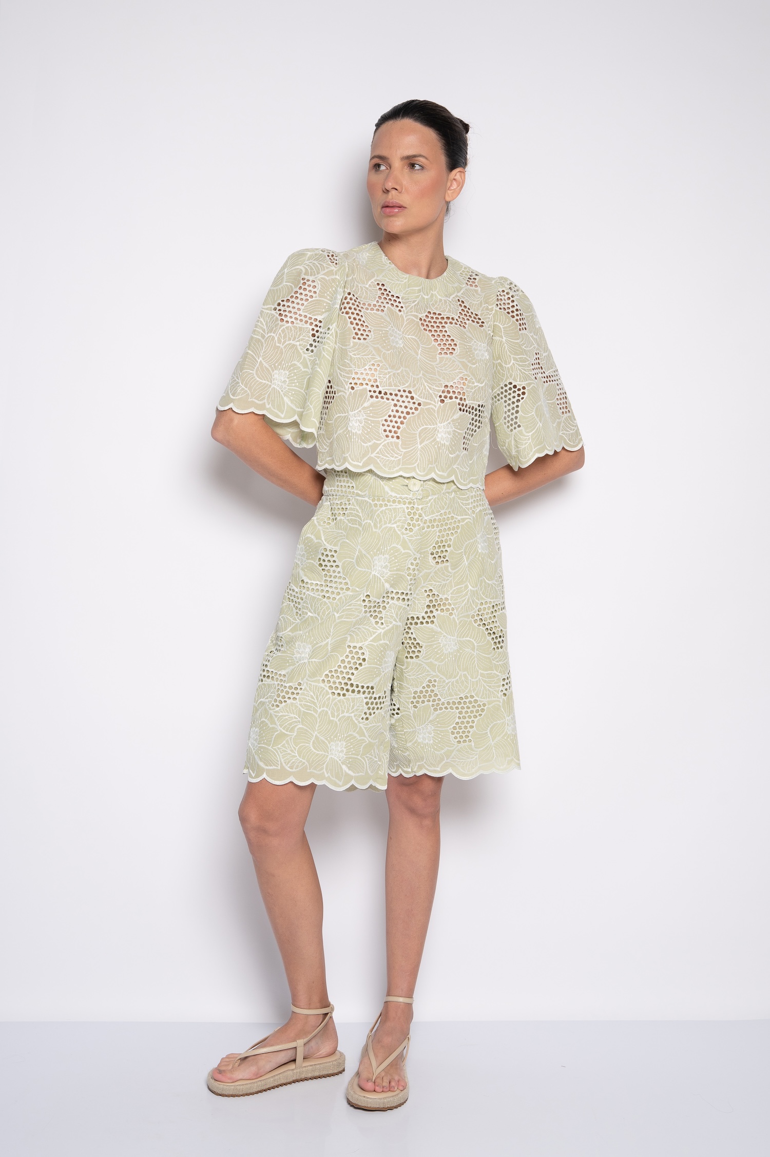 Além disso, a camisa cropped é versátil, podendo ser usada tanto no dia a dia quanto em eventos mais informais. Ela combina facilmente com shorts, saias e calças, adaptando-se a diferentes estilos. A borda bordada se destaca na peça, trazendo um acabamento refinado e que agrega valor ao seu guarda-roupa.