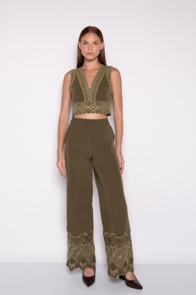 A camisa cropped bordada combina perfeitamente com calças de alfaiataria. Além disso, harmoniza com saias midi ou jeans de cintura alta.