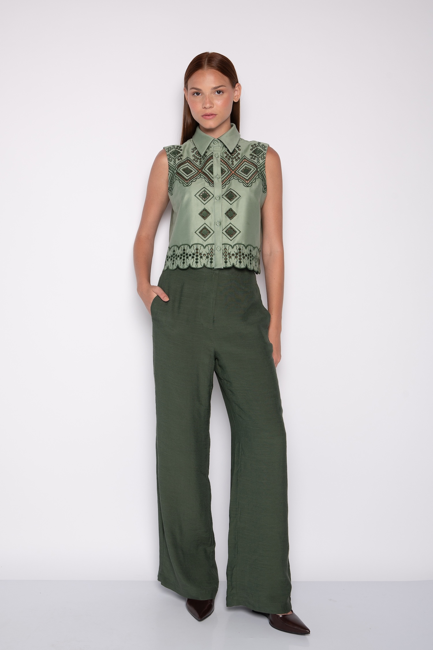 A camisa cropped bordada combina perfeitamente com calças de alfaiataria. Além disso, harmoniza com saias midi ou jeans de cintura alta.