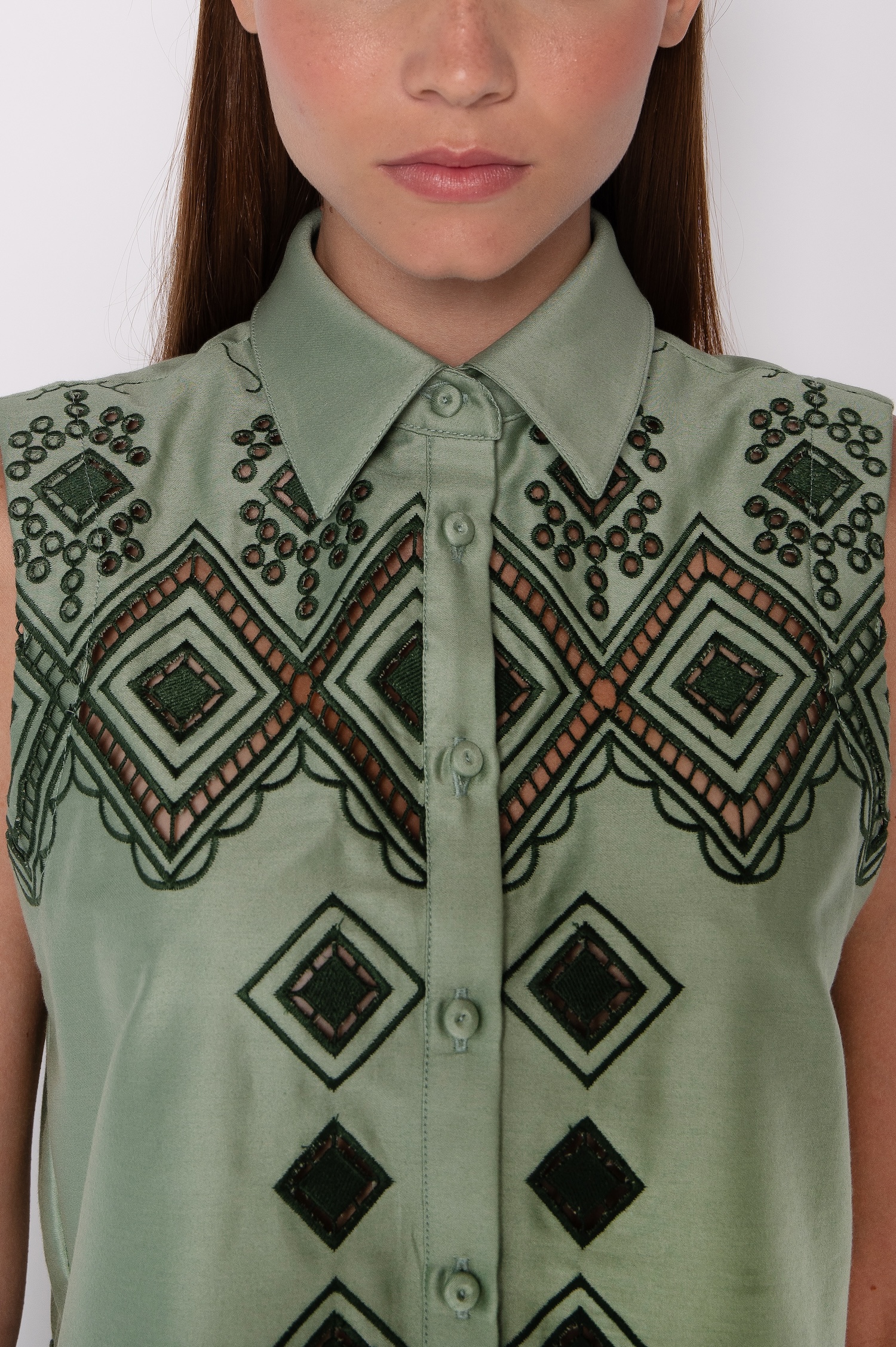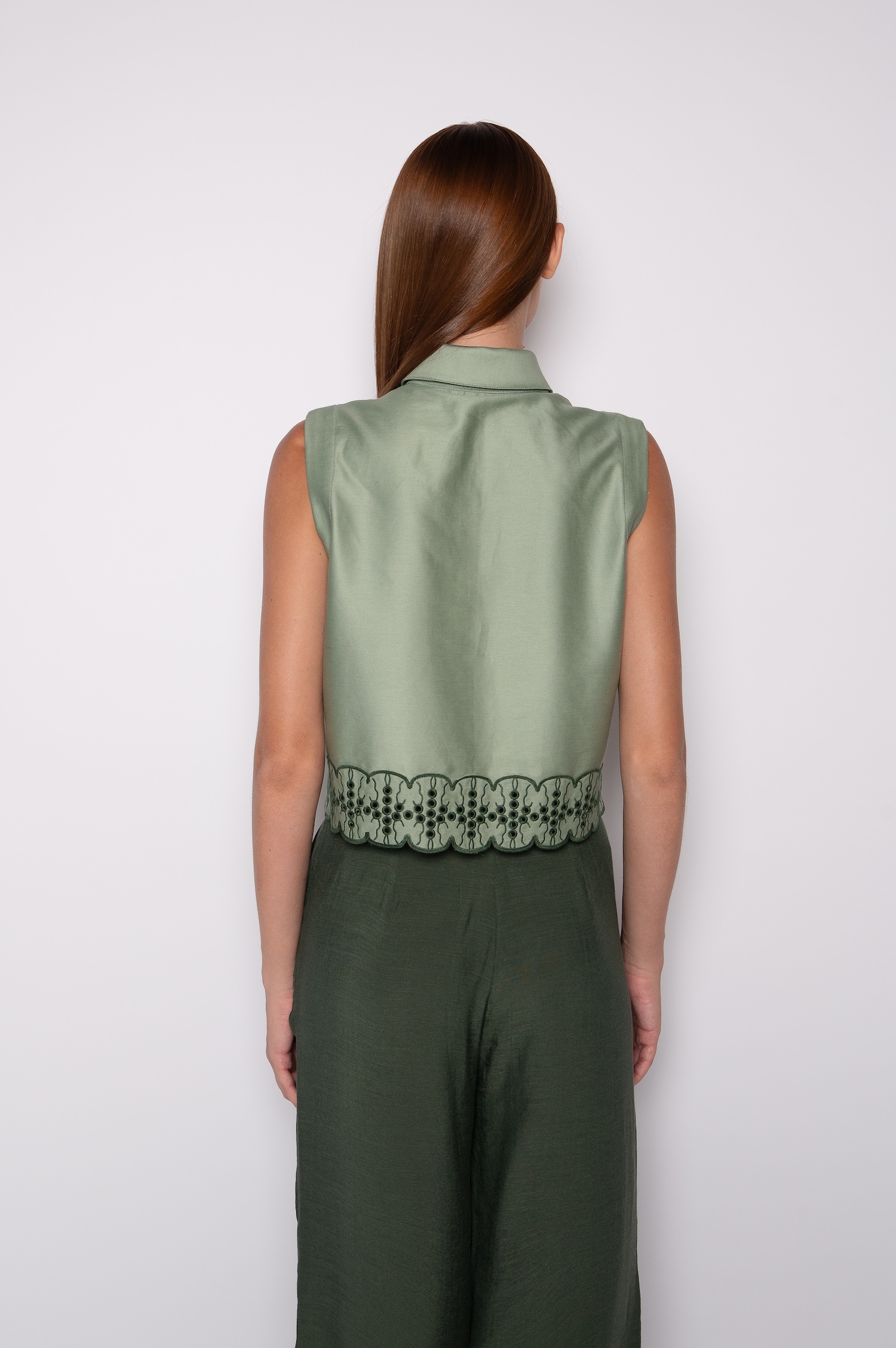 A camisa cropped bordada apresenta gola tradicional estruturada e pé de gola definido. Assim, o acabamento reforça a elegância da peça.