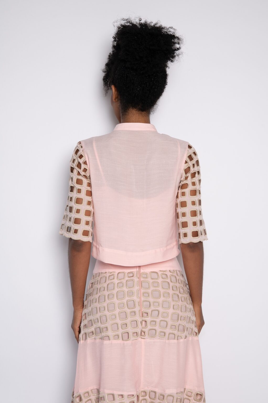 Camisa cropped bordada com gola mandarim rosa doce – Angélica