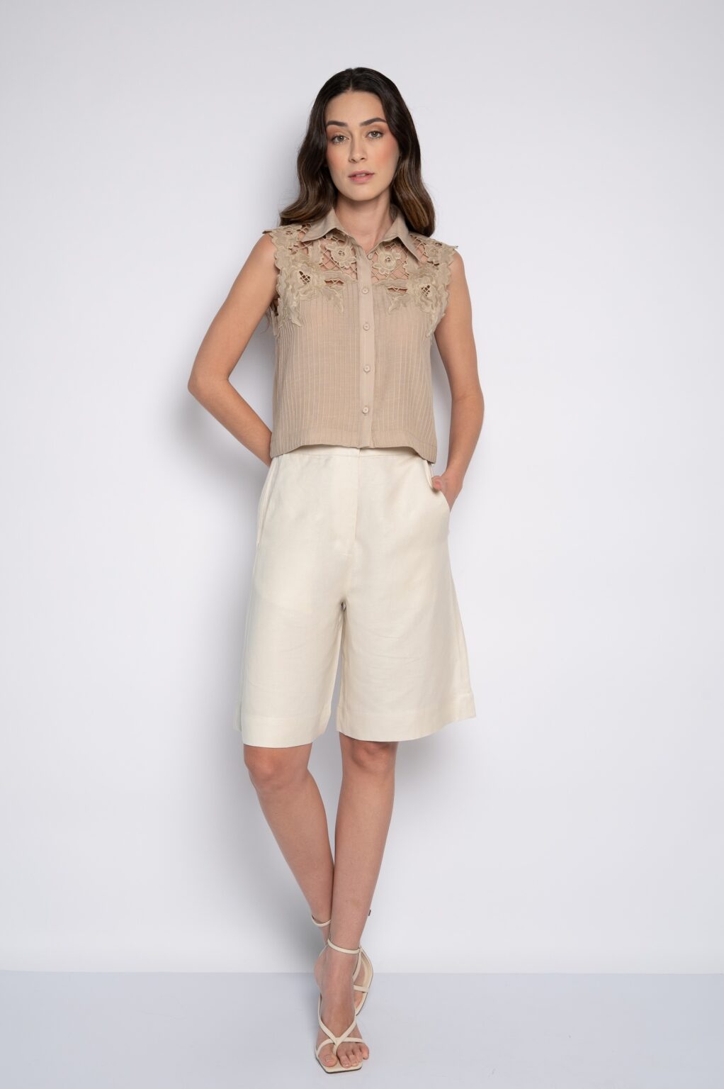 A camisa cropped bordada cavada nervura conta com fechamento frontal por botões cobertos, mantendo o visual limpo e elegante.