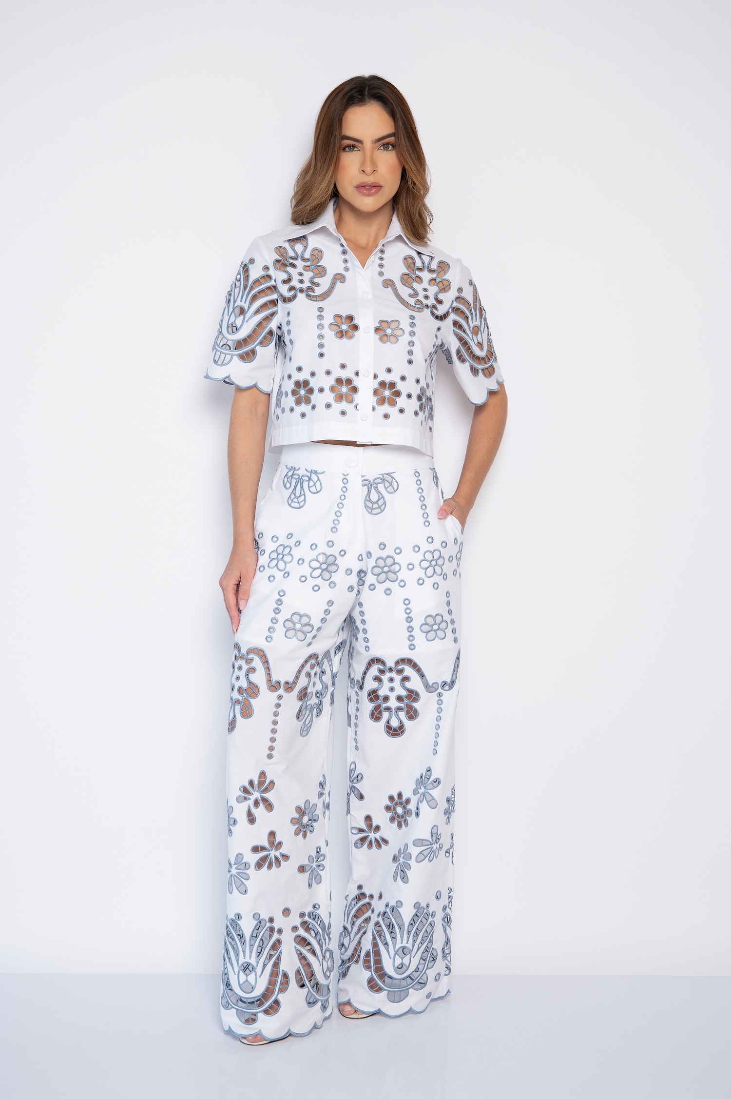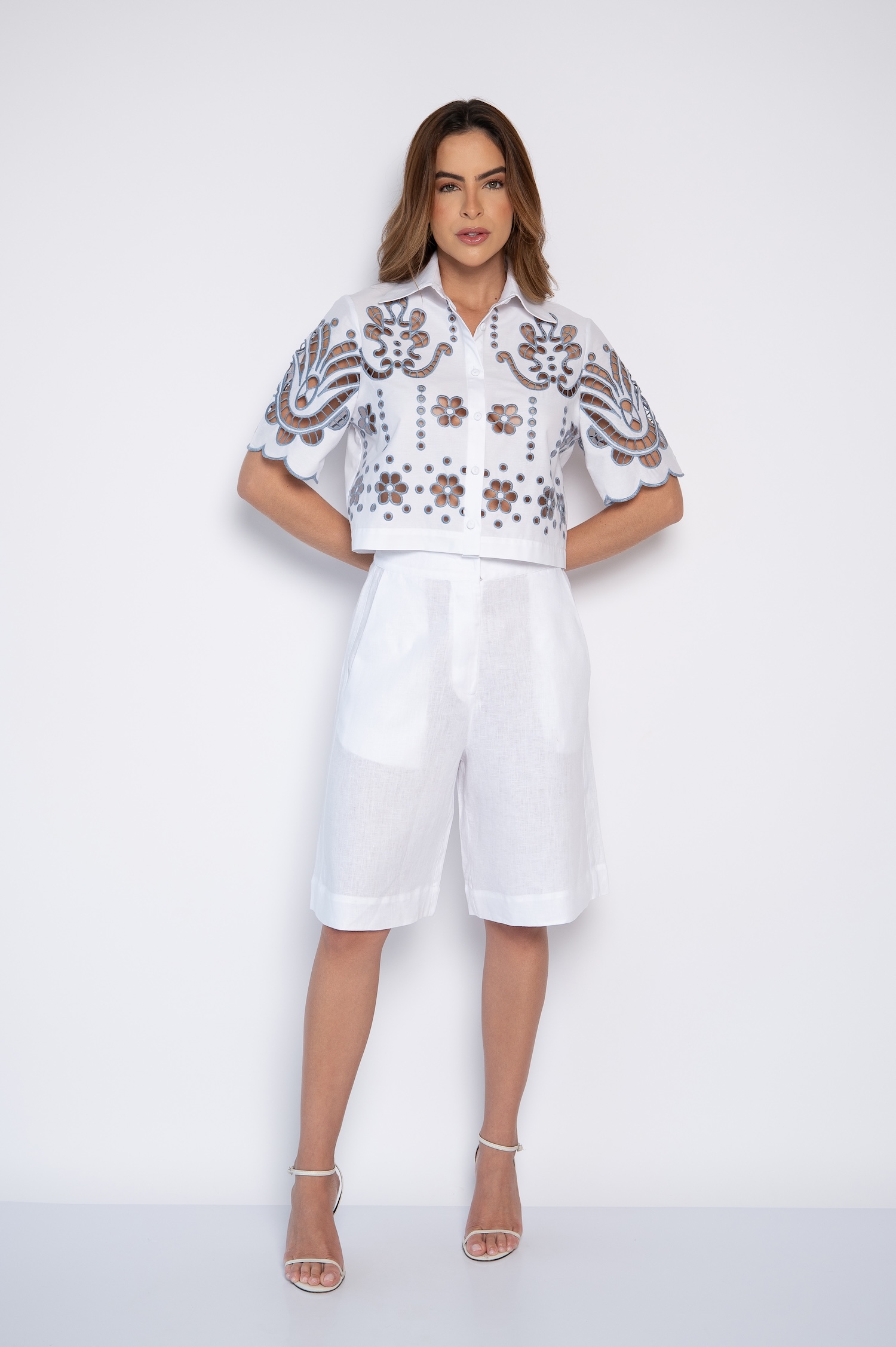 A camisa cropped bordada manga curta com botões combina facilmente com peças de cintura alta, criando uma silhueta equilibrada e sofisticada. Com acessórios delicados, o look ganha charme adicional.