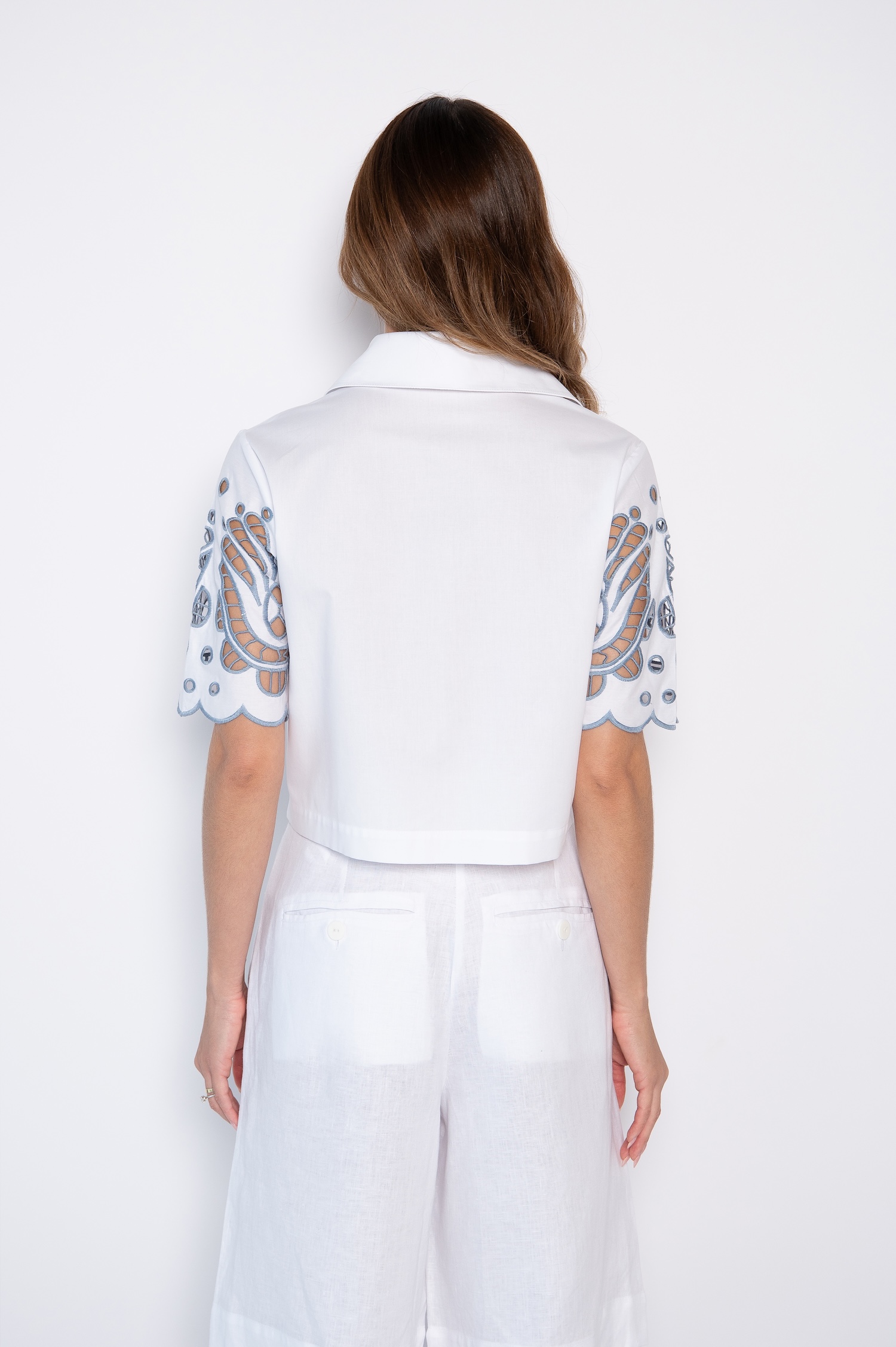 Camisa Cropped Bordada Manga Curta Branca/Azul – Kaline