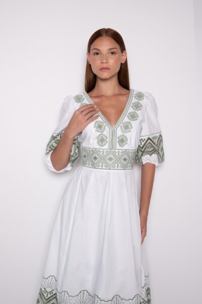 O abotoamento frontal facilita o uso no dia a dia. Além disso, os botões harmonizam perfeitamente com o bordado sofisticado.