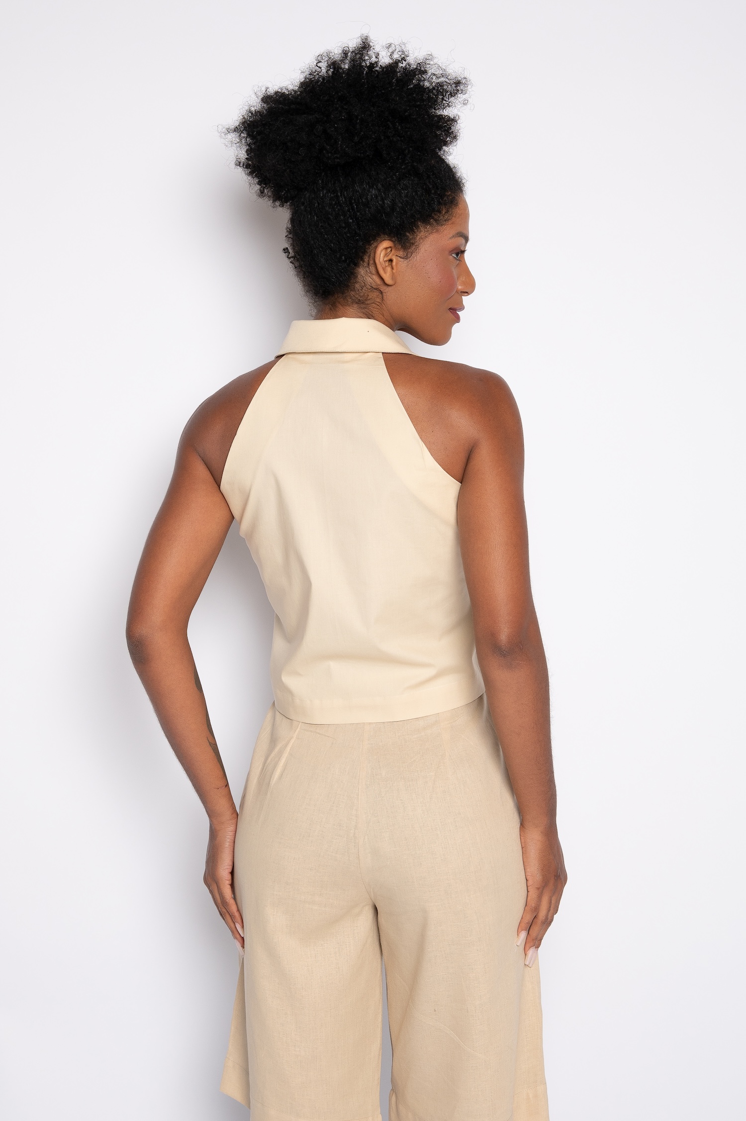 Seu design cavado proporciona frescor e liberdade, ideal para dias quentes ou produções mais despojadas. Apesar do corte moderno, mantém um acabamento sofisticado e delicado.