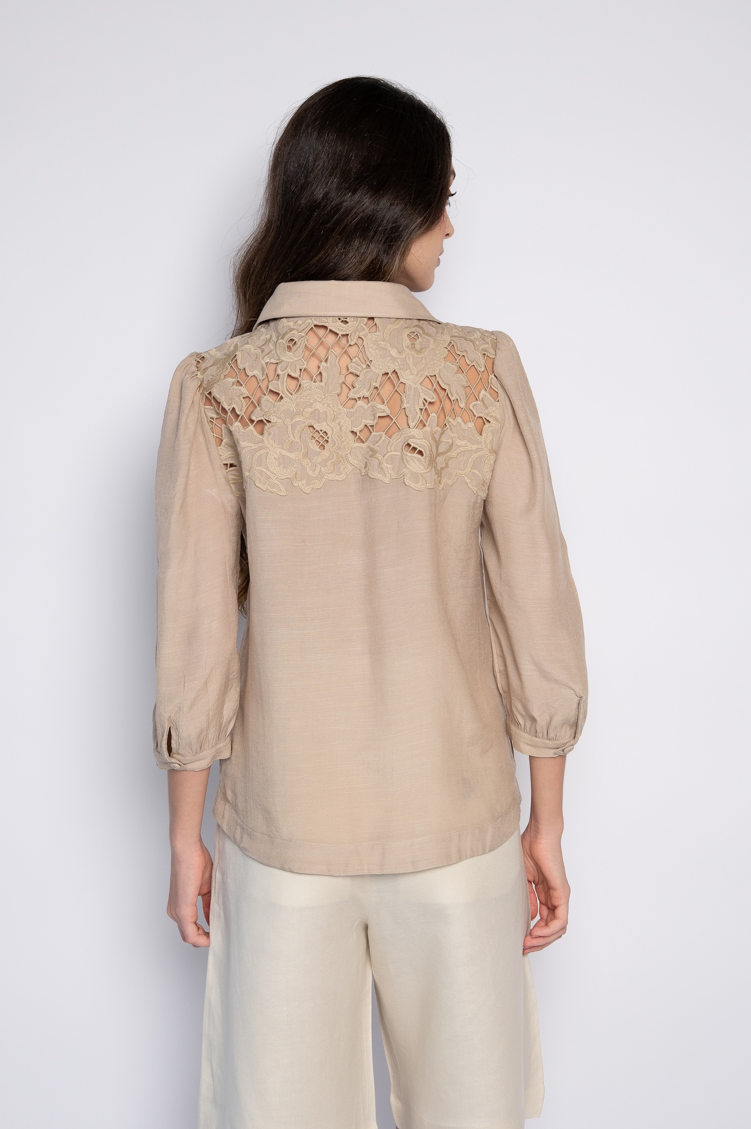 Camisa de manga 3/4 bordada caqui – Clarisse