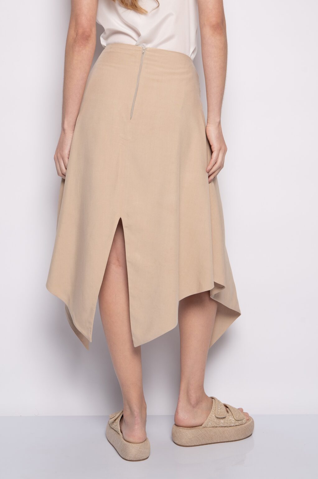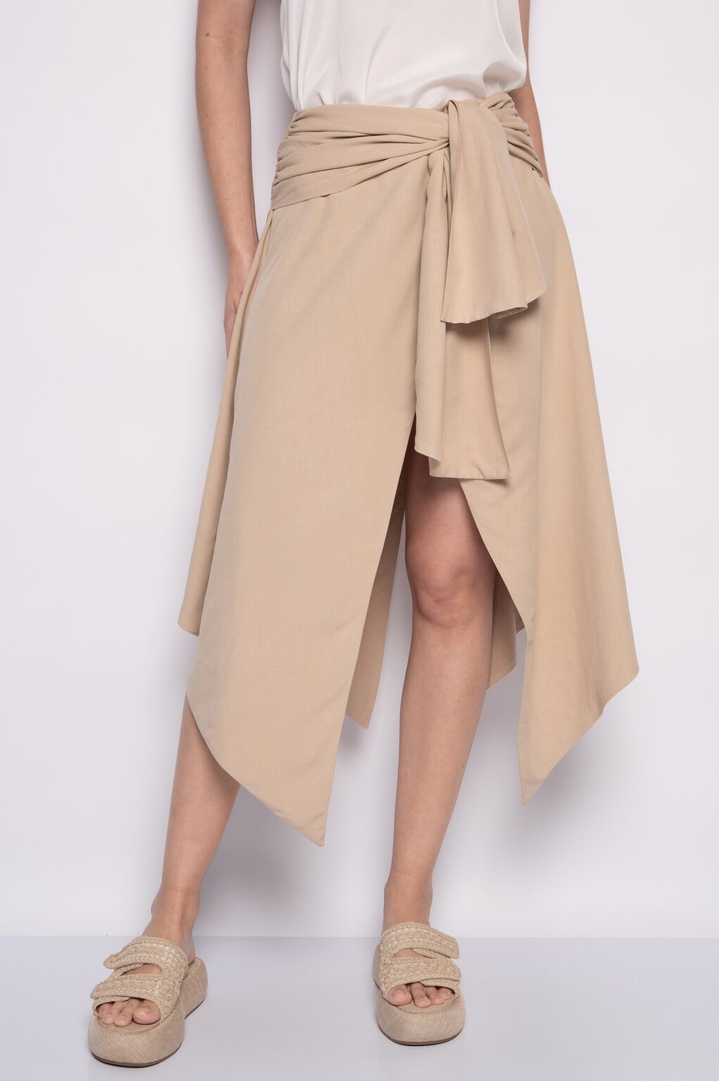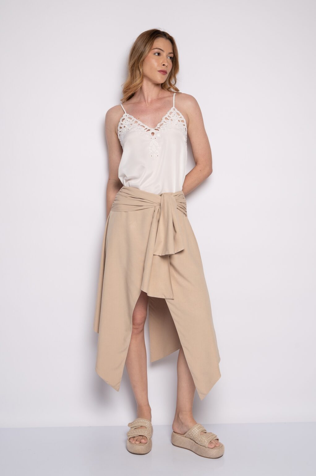Saia assimétrica com fenda frontal e amarração caqui – Fernanda