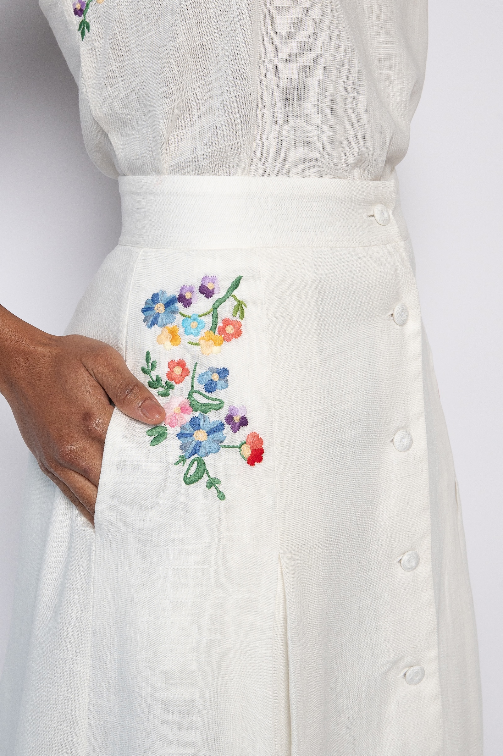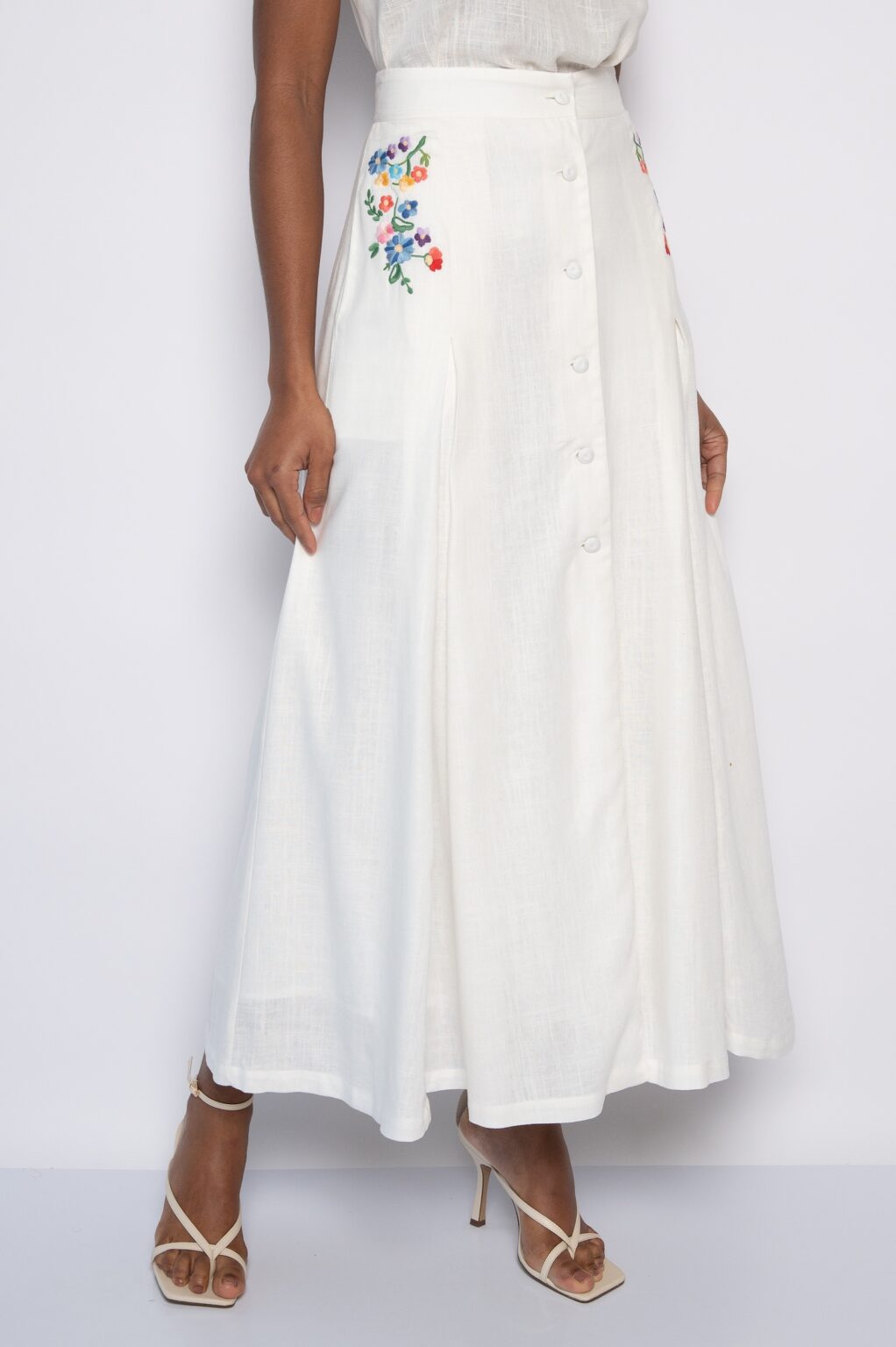 Em resumo, esta saia longa traduz estilo e atemporalidade. Cada bordado floral valoriza sua presença com delicadeza única.