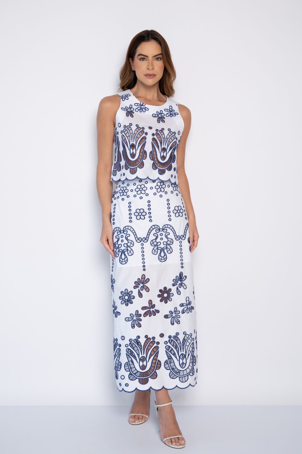 Saia Midi Bordada com Fendas Laterais Branco/Azul – Gabriela