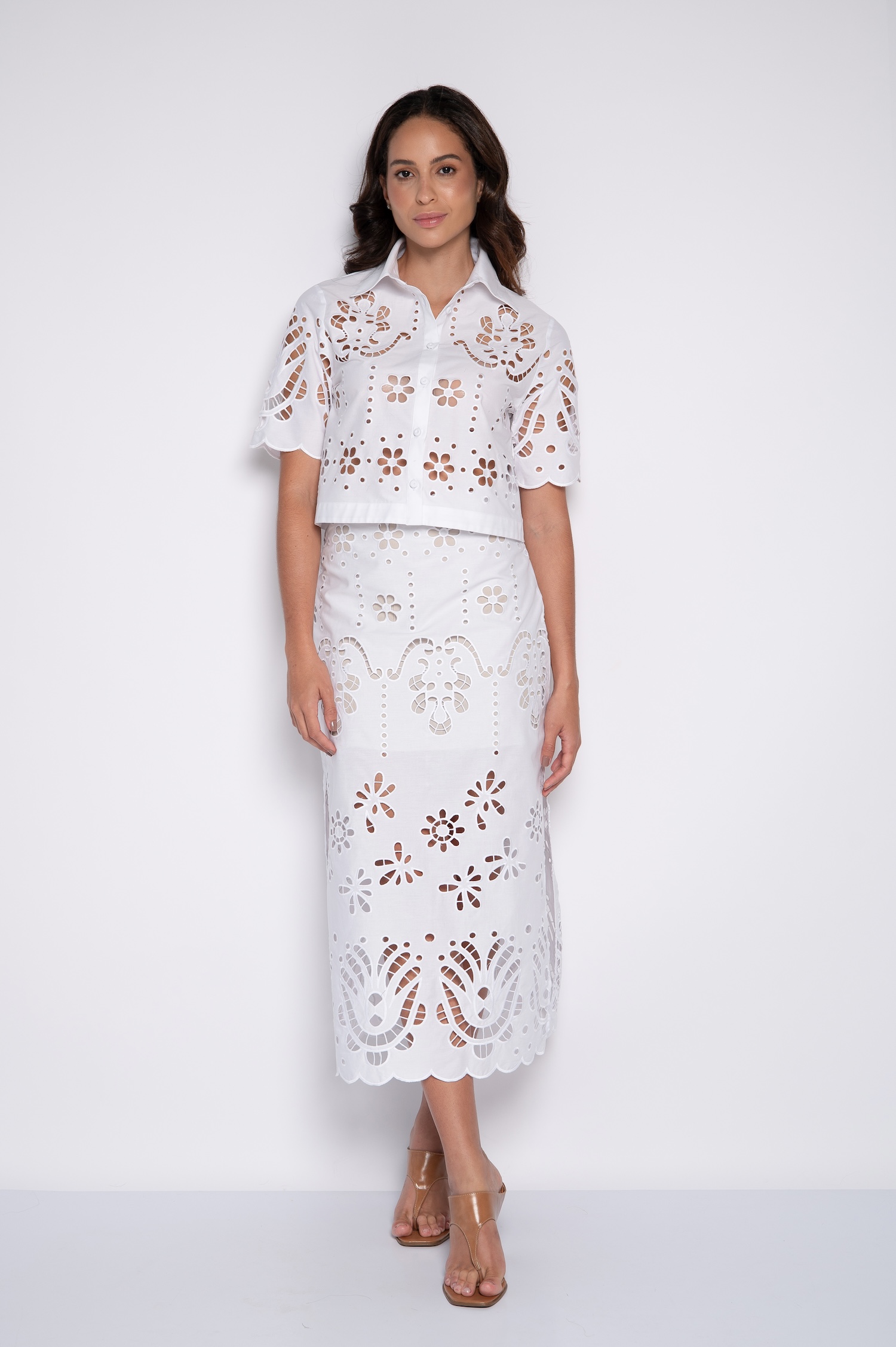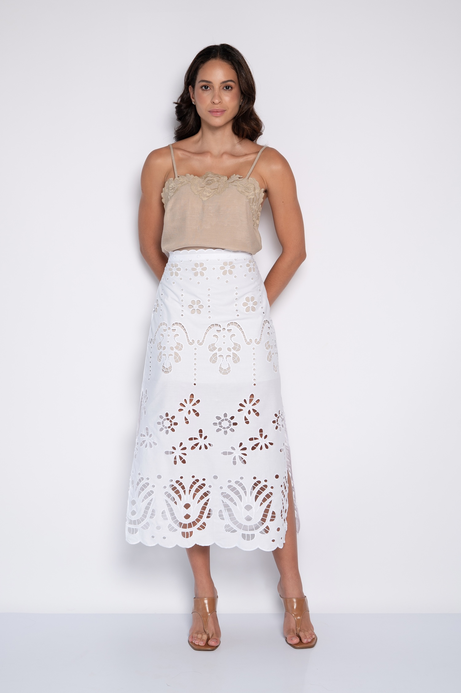 A saia midi bordada com fendas laterais é ideal para criar looks elegantes e atemporais. Sandálias, saltos ou rasteiras podem ser usados para diferentes propostas, garantindo sempre um visual equilibrado e feminino.
