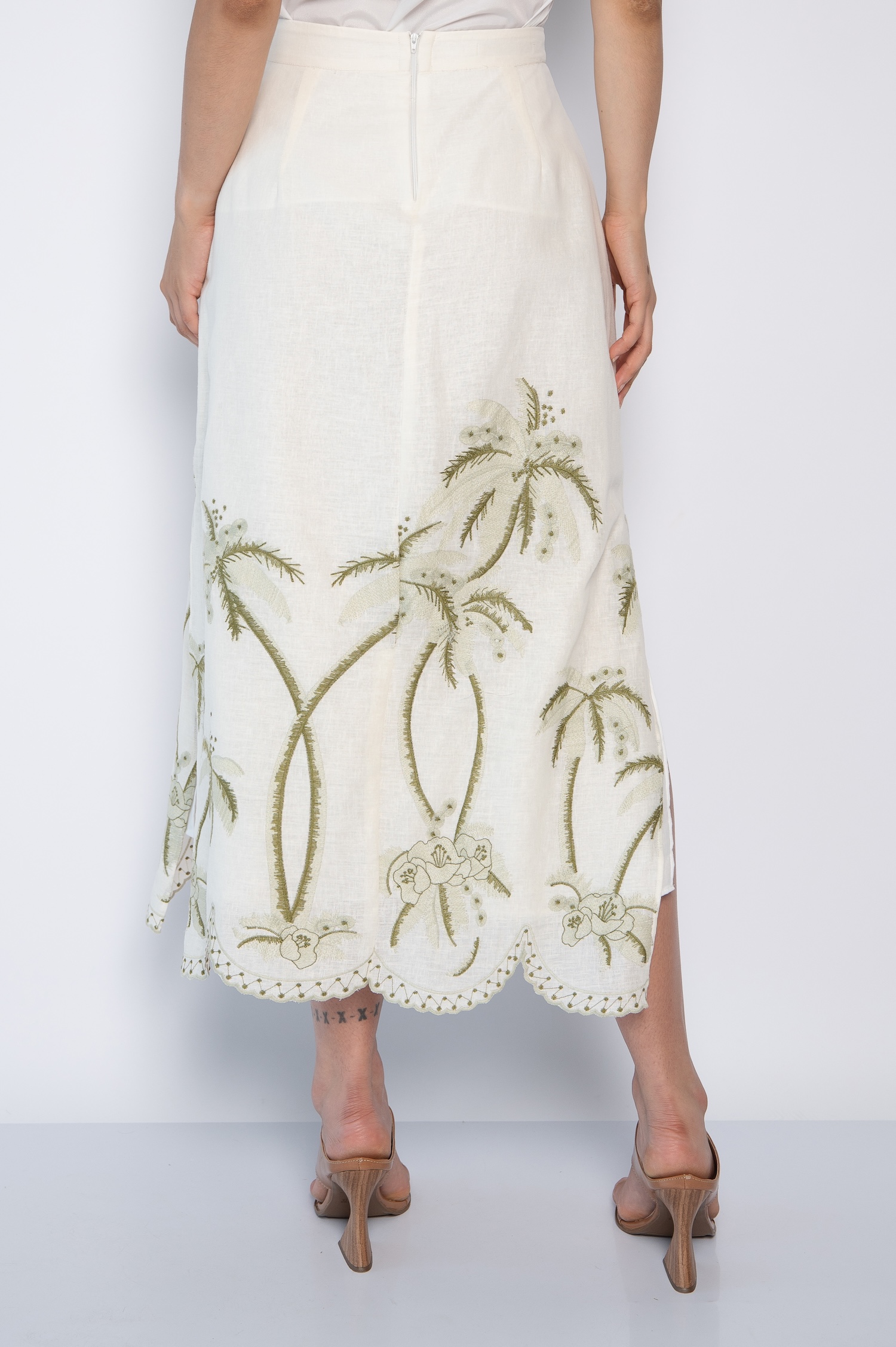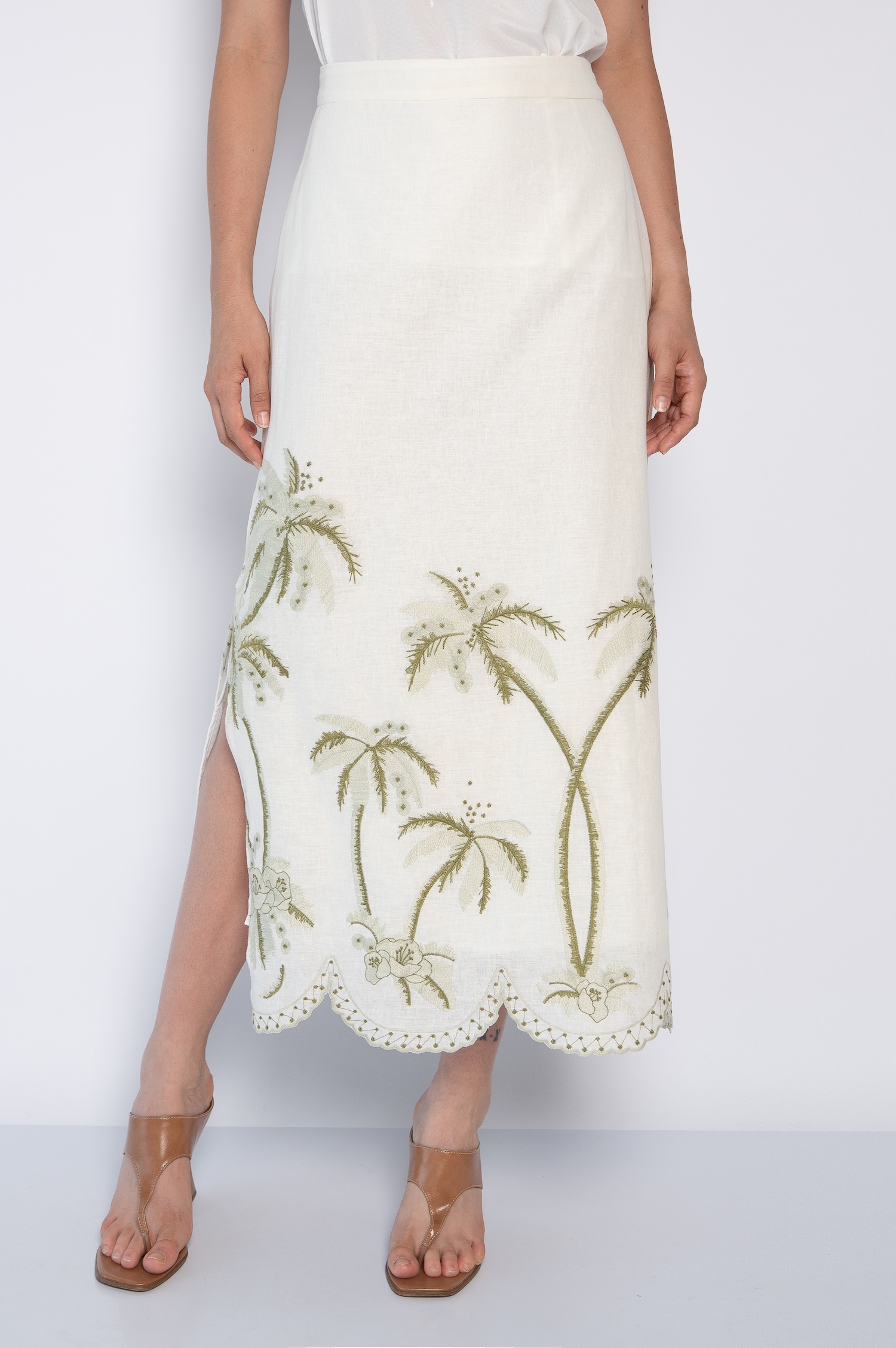Saia Midi Bordada com Fendas Laterais Off White – Grazy