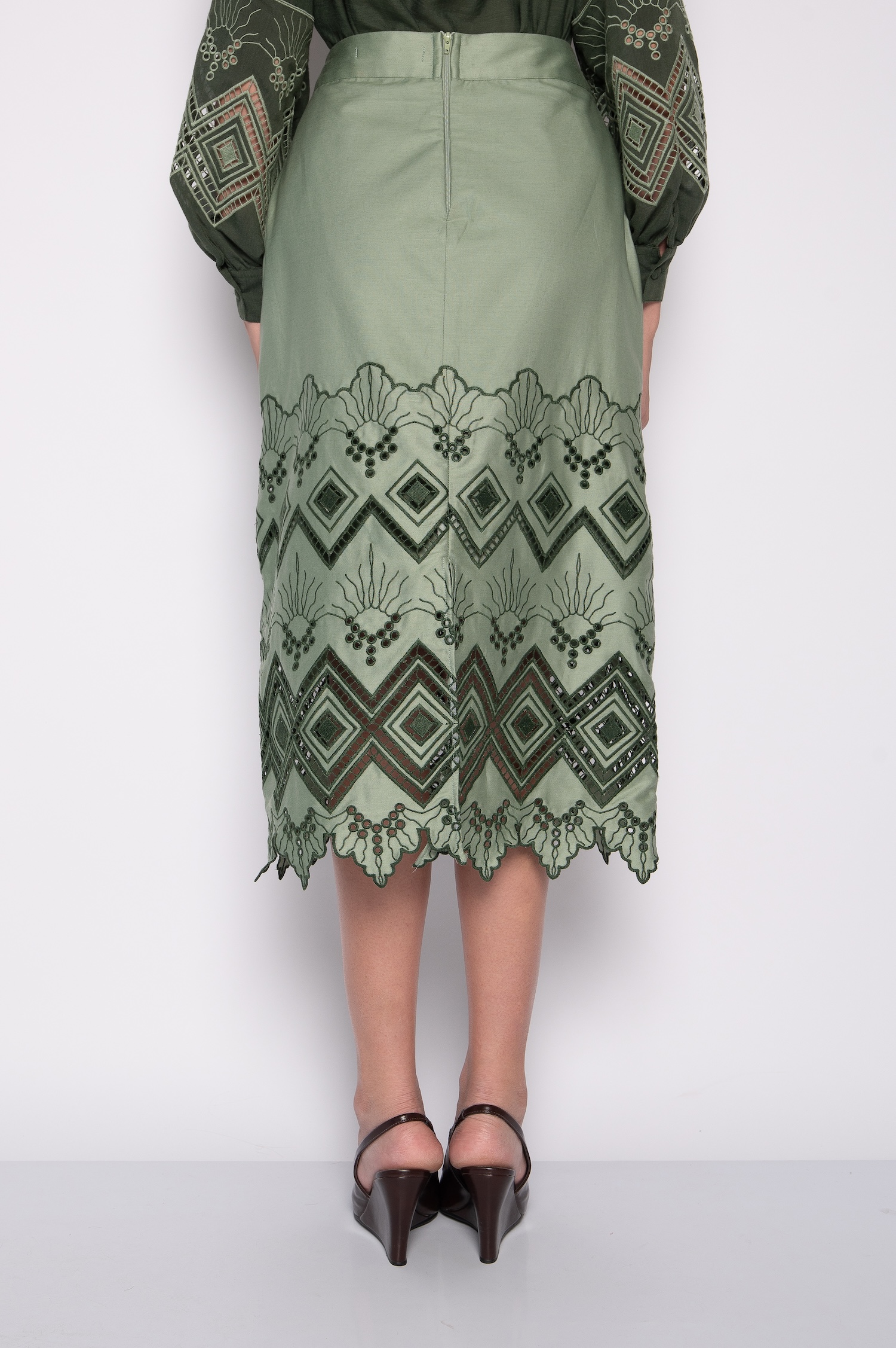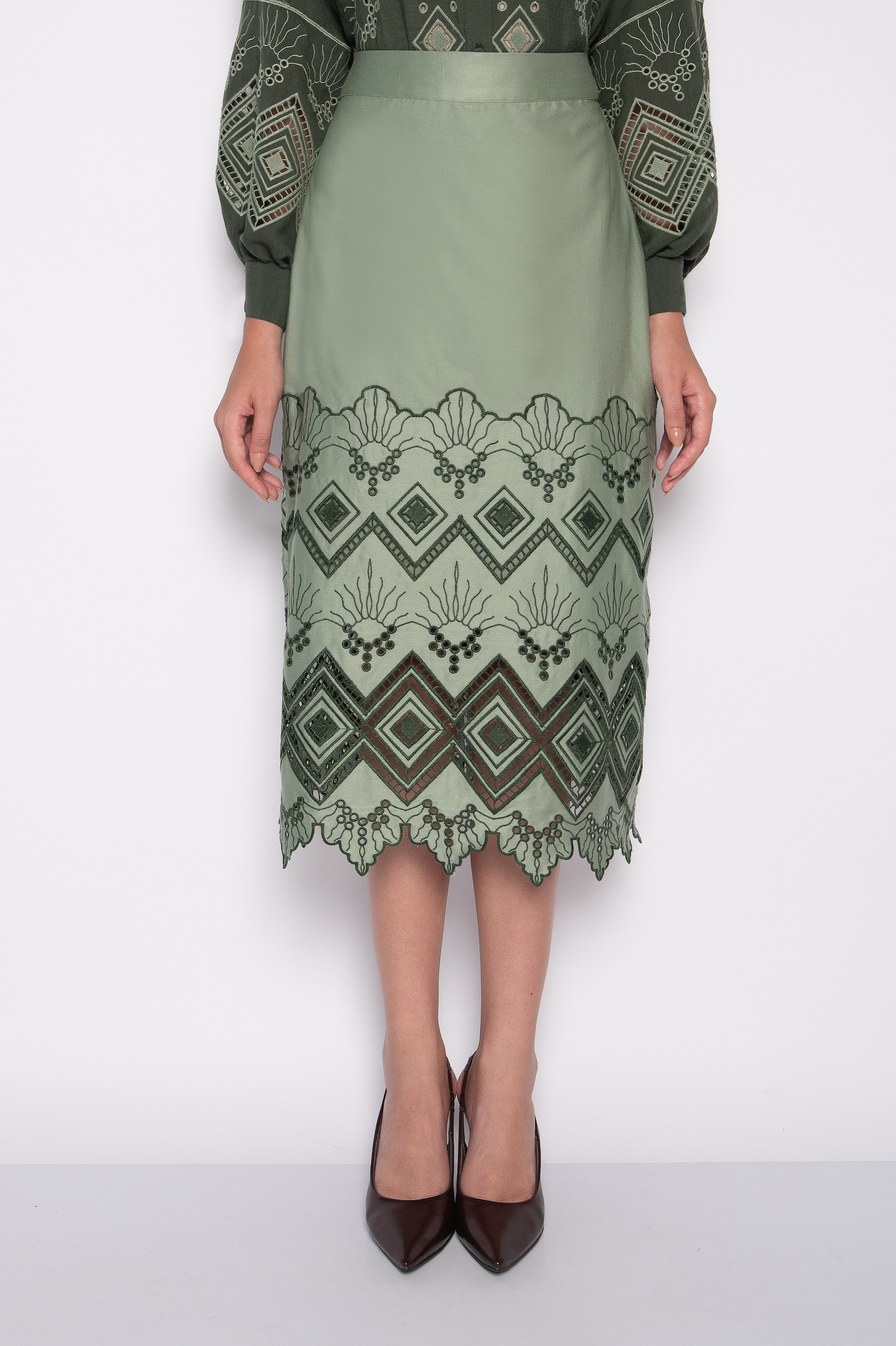 A saia midi bordada com zíper é a escolha ideal para produções sofisticadas. Além disso, o bordado valoriza cada detalhe do design.