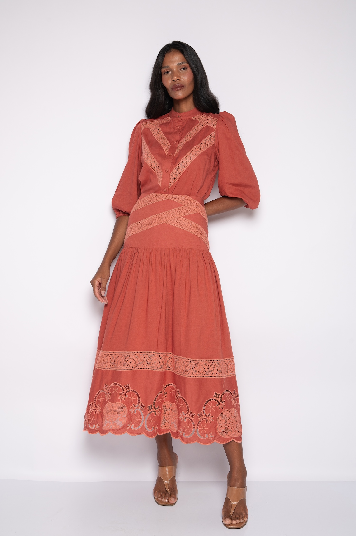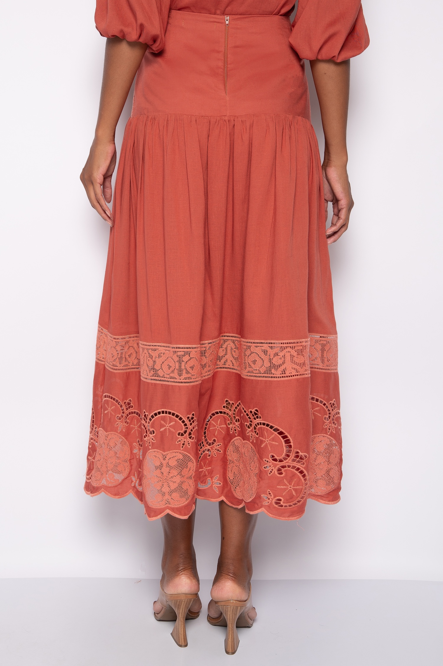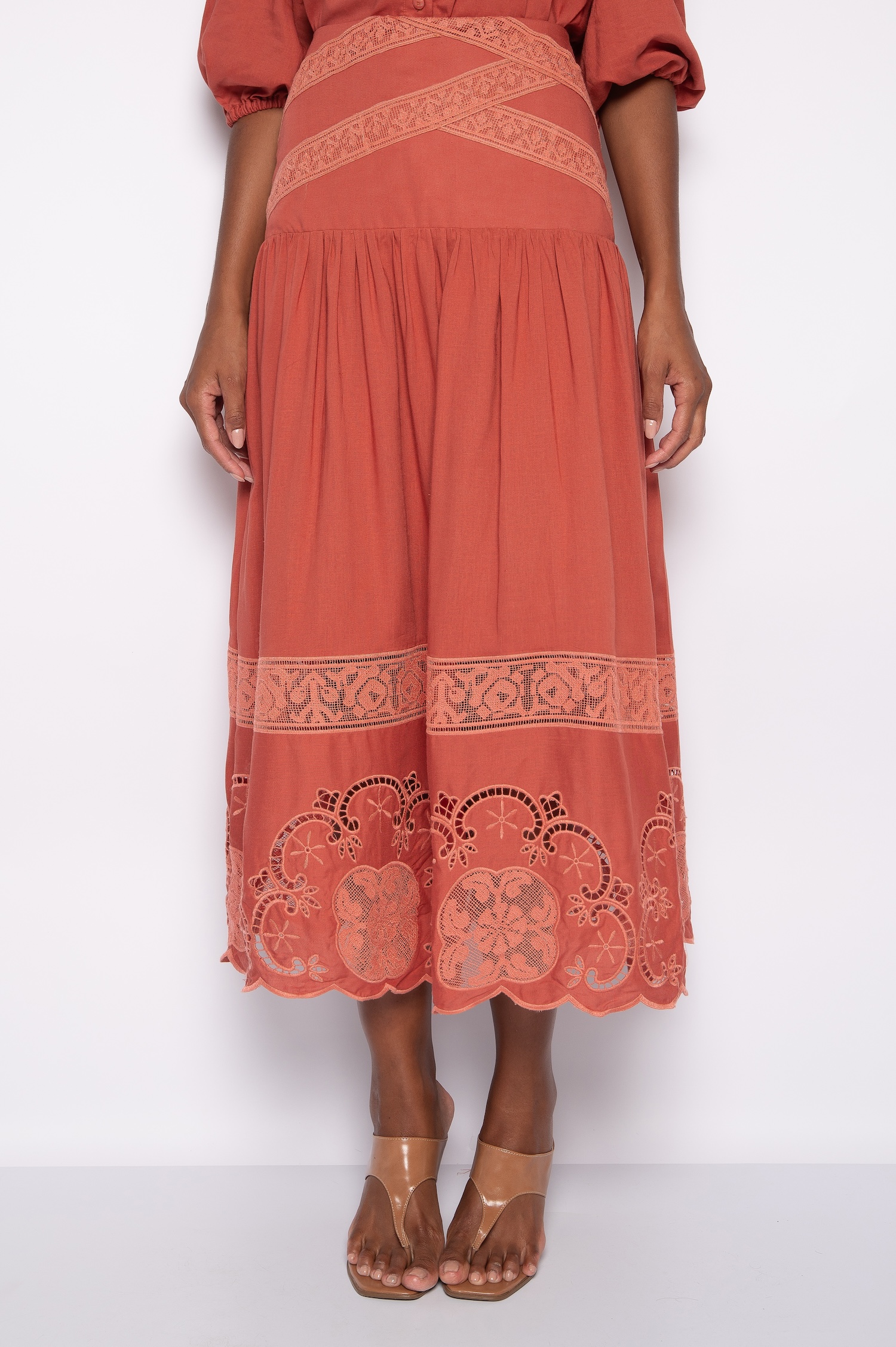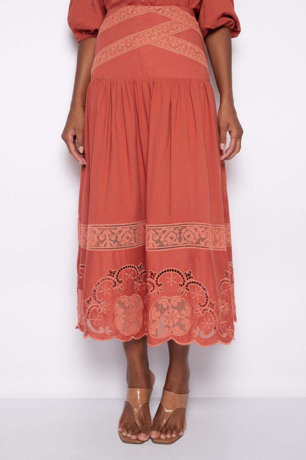 O design atemporal favorece diferentes estilos. Por isso, a saia midi franzida bordada se torna peça-chave no guarda-roupa.